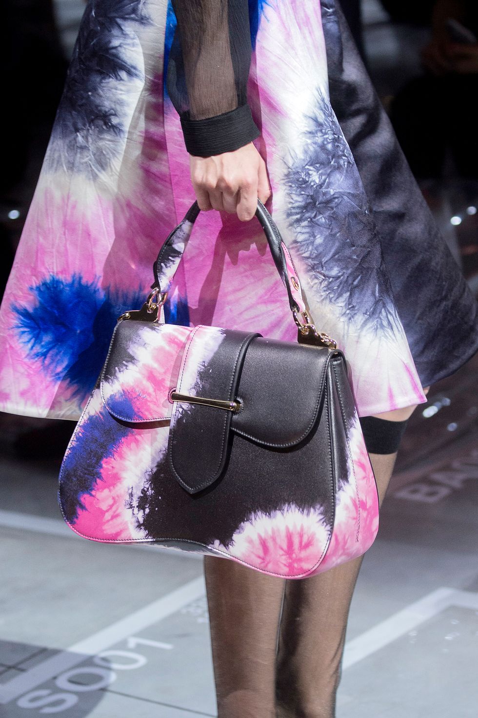 Miuccia Prada brought Swinging Sixties whimsy to her otherwise prim collection with vibrant tie dye prints. Lady-like leather handbags were transformed into bold statement pieces with whirls of bright pink and deep blue.