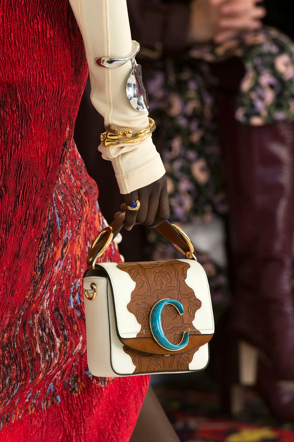 Natacha Ramsay-Levi introduced a new range of accessories — rather work-ready for a collection rooted in fluid Grecian dressing — at Chloé's spring 2019 show. On this bag, punctuated by calligraphic C's, a turquoise stone carved into the house's first initial pops against crisp white and rich chocolate leather.