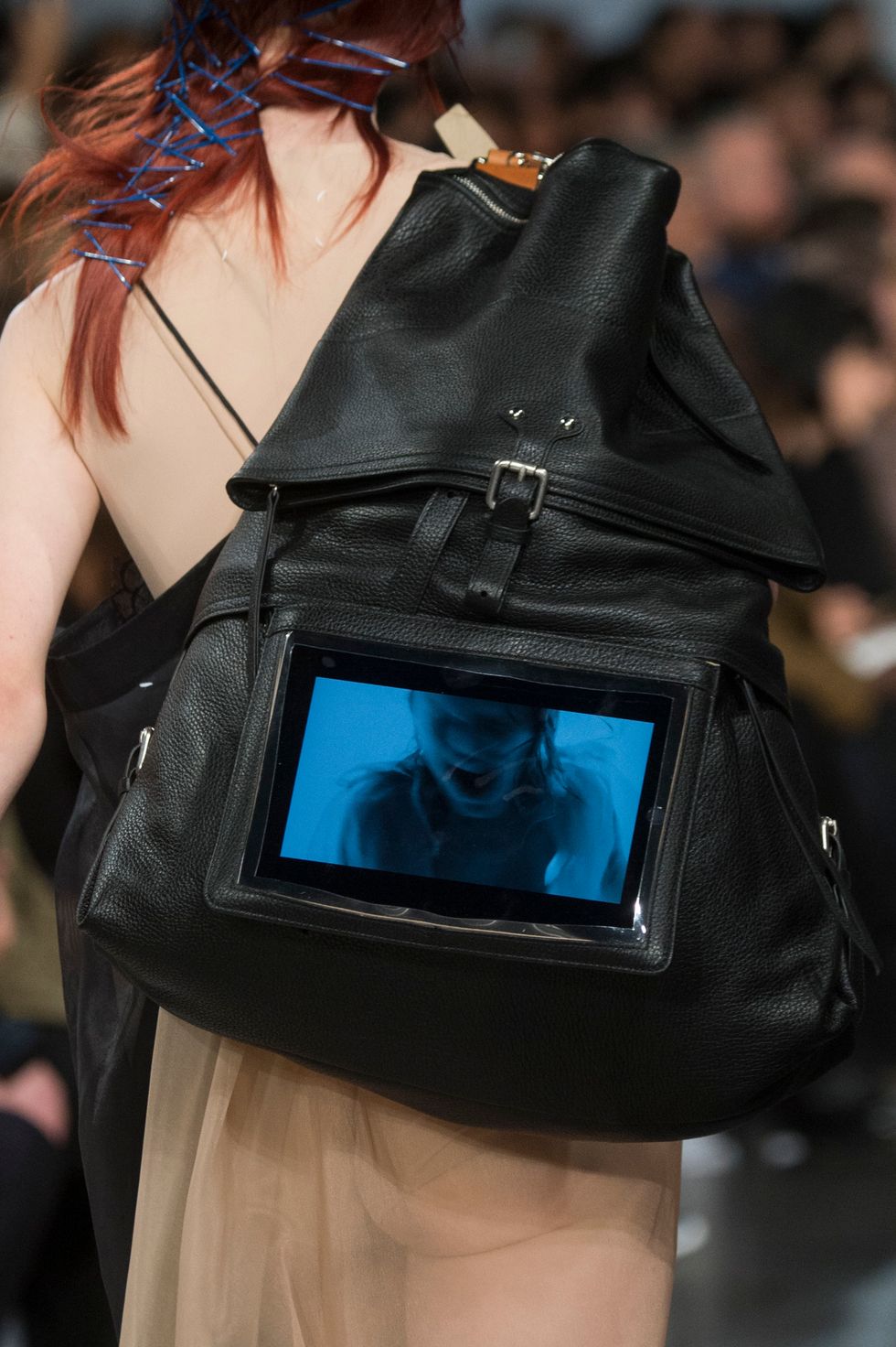 John Galliano's reflection on identity in a tech-obsessed world has carried forward from his fall 2018 haute couture collection. At Maison Margiela's spring 2019 show, iPads peering through clear plastic pockets on backpacks, played scenes from the short film for "Mutiny," the house's first fragrance under the designer's reign.