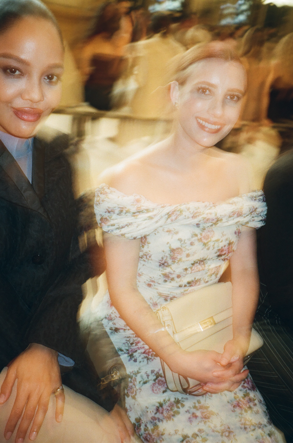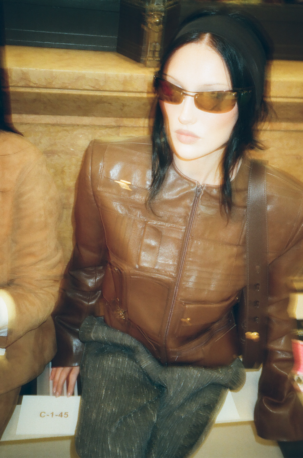 Jewelry went maximalist: glass flowers, twisted chains, pearls and shells threaded through lapels and slits in jackets. Sunglasses wrapped around faces like shields from the future, while antique pins were affixed to everything from straps to bags, lending an old world wink.