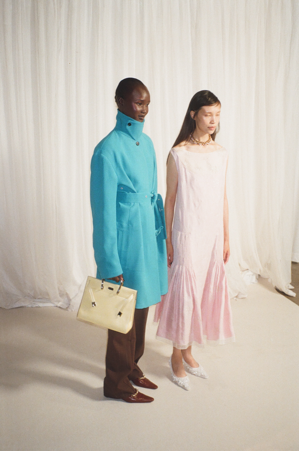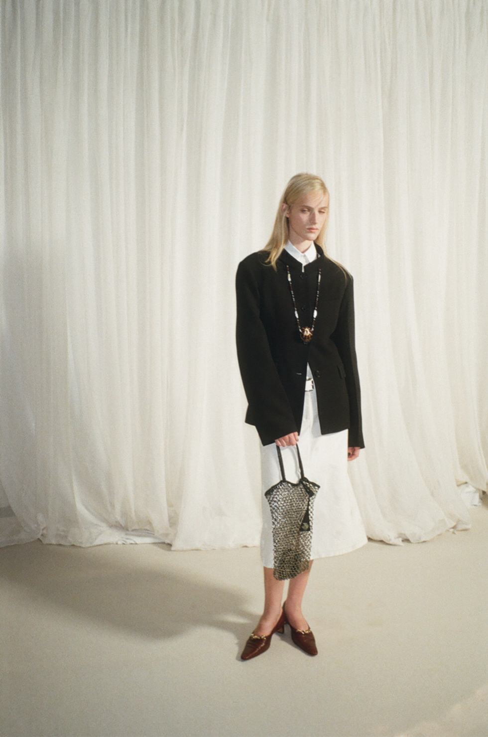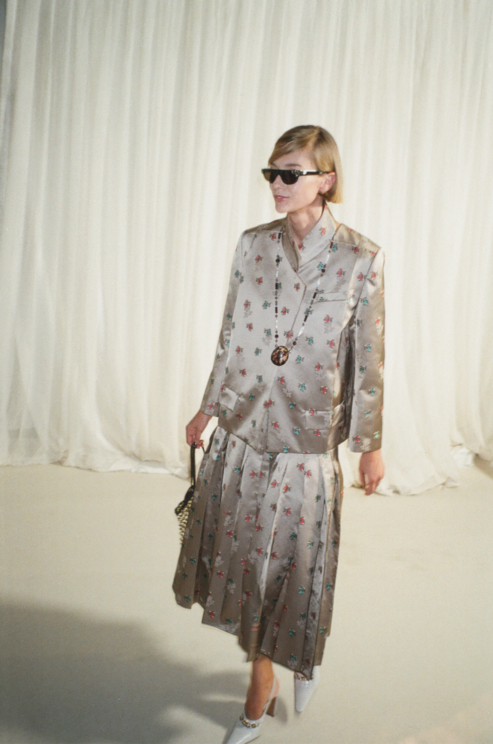 This season marked a renewed obsession with embellishment. Mesh dresses and cardigans dripped in hand-stitched beading, silk chiffon was painstakingly pleated, and monogram embroidery referenced antique samplers, each initial belonging to a member of Burch’s design team. It was craft, but with a whisper of sentimentality.