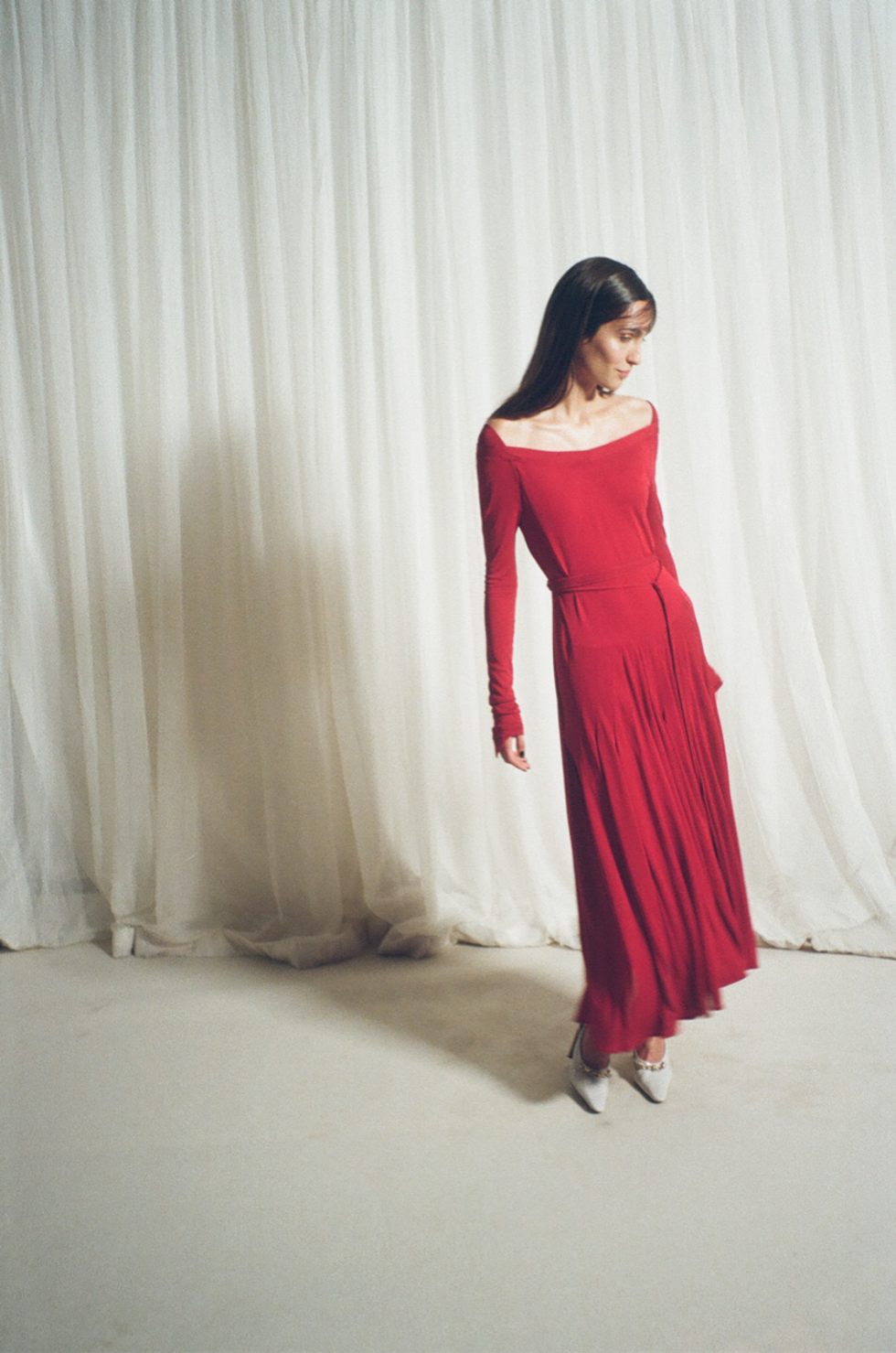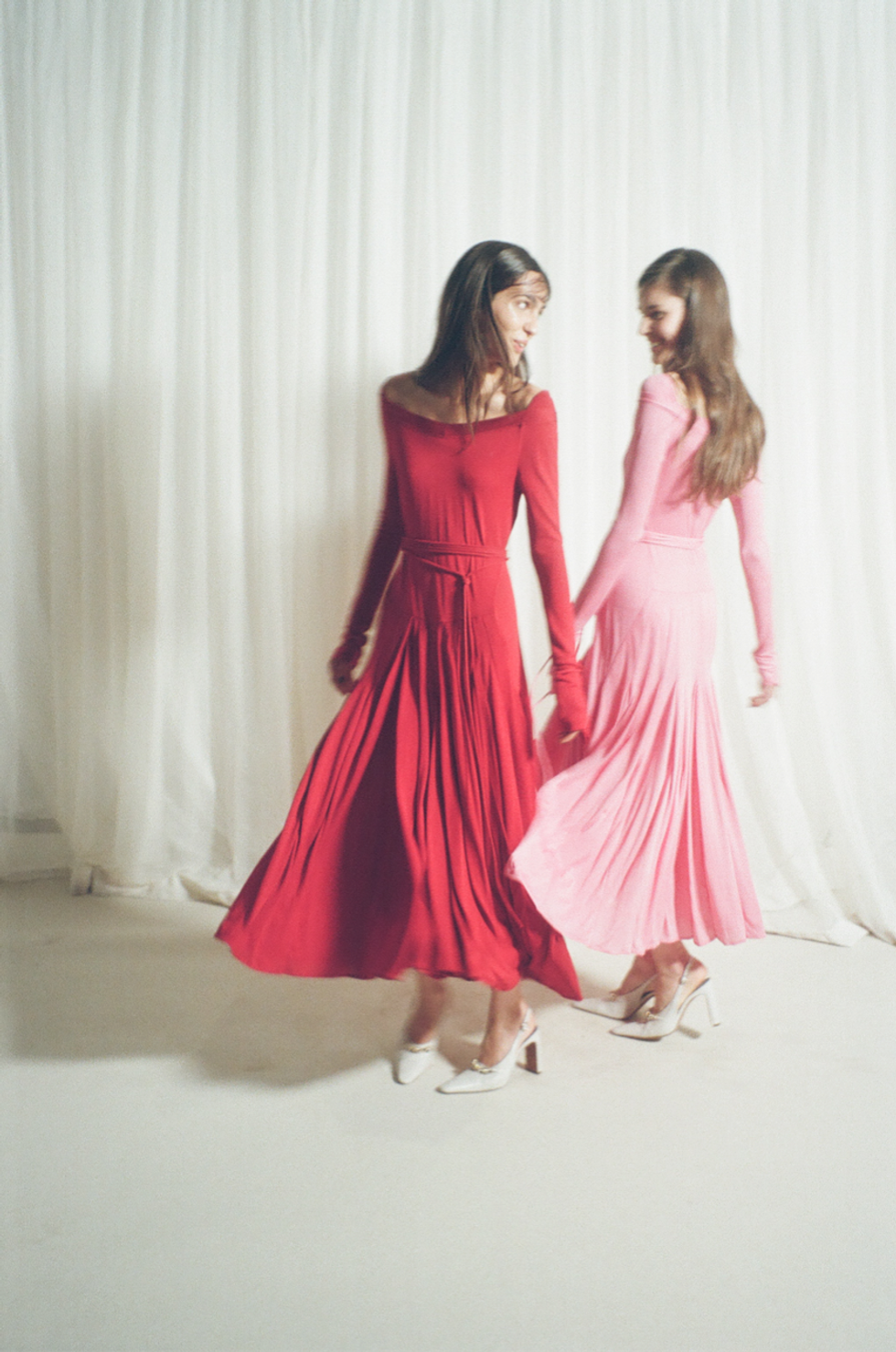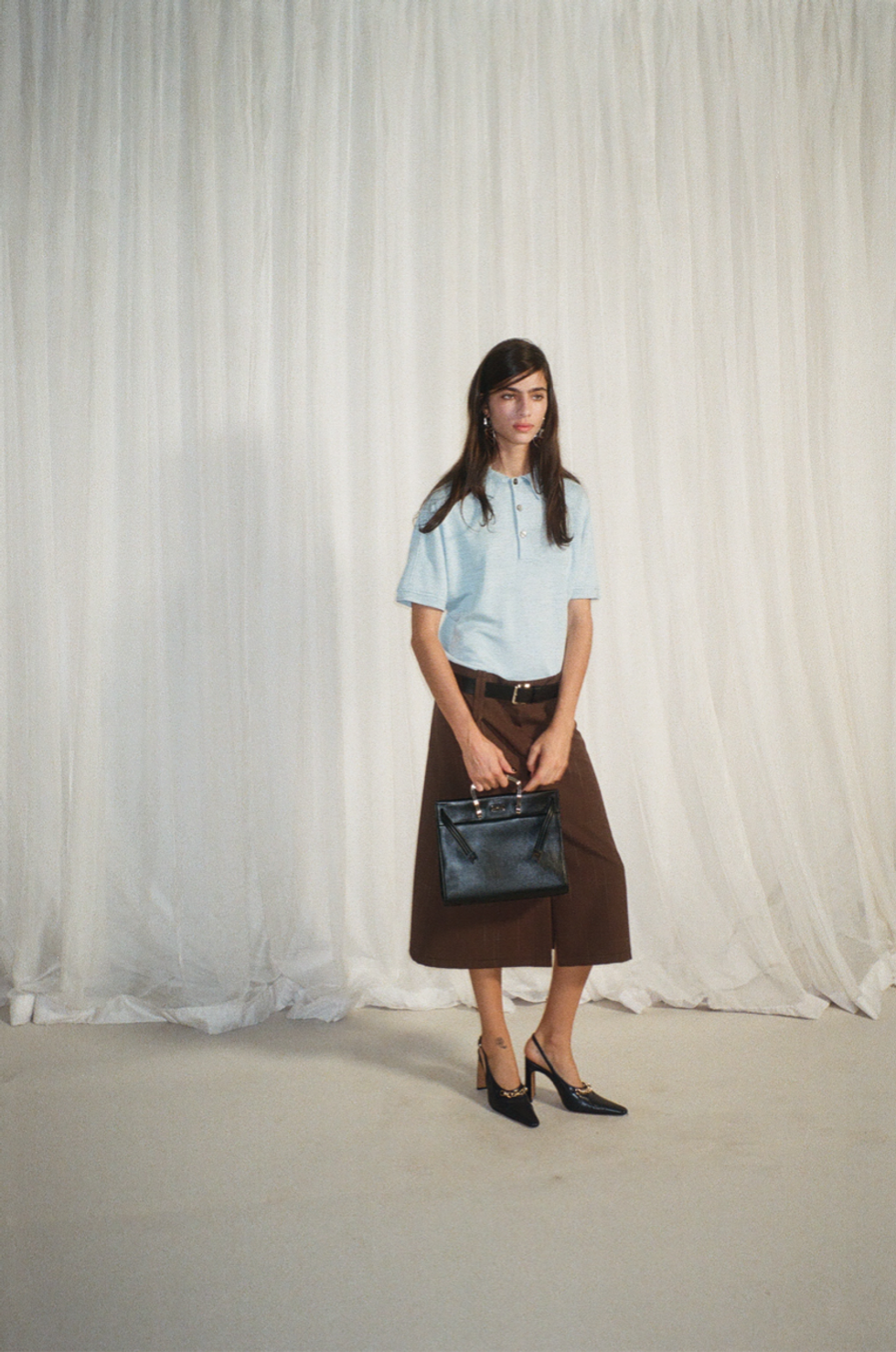 This season marked a renewed obsession with embellishment. Mesh dresses and cardigans dripped in hand-stitched beading, silk chiffon was painstakingly pleated, and monogram embroidery referenced antique samplers, each initial belonging to a member of Burch’s design team. It was craft, but with a whisper of sentimentality.