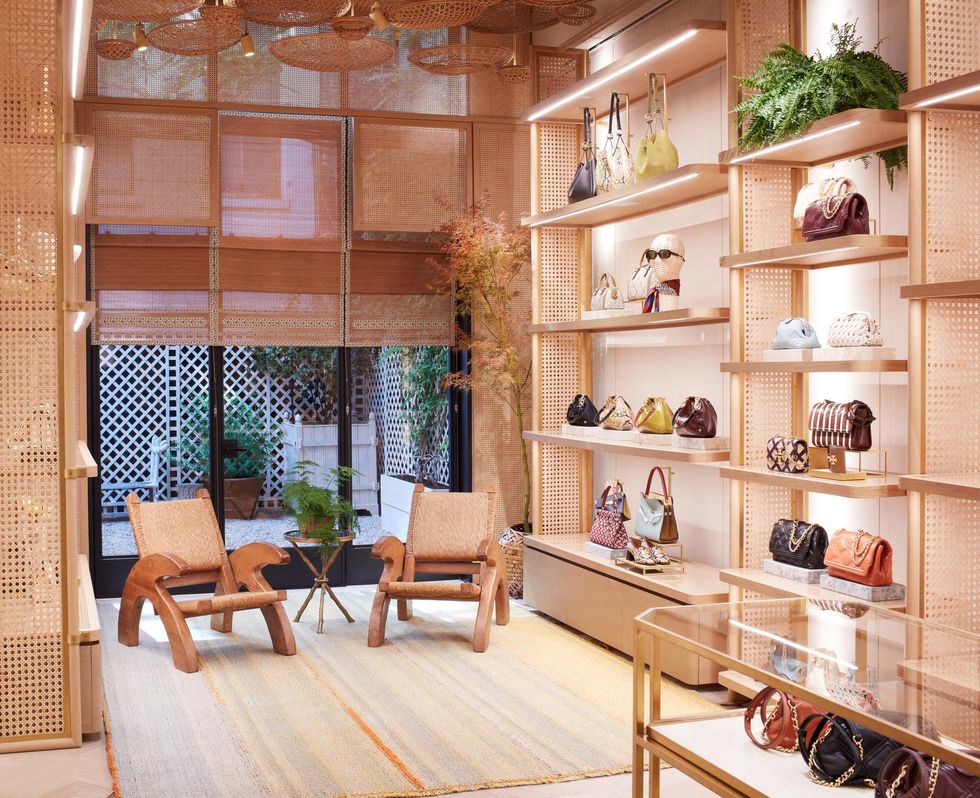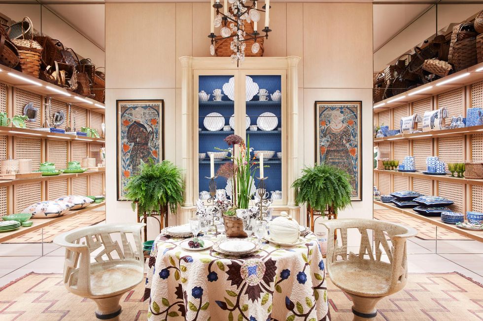 Burch pulled details from her life and travels to help design and curate the architectural vision of the boutique. Above the first floor handbag area, woven baskets hang from the ceiling as a nod to the designer's childhood kitchen in Valley Forge, Pennsylvania that had baskets hung from all over the world. "I was showing pictures of the store to my mother and she was immediately filled with nostalgia," Burch says.