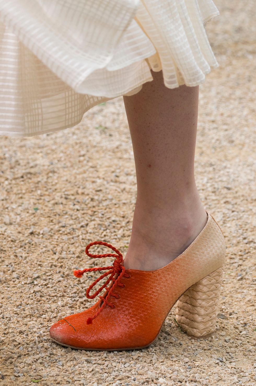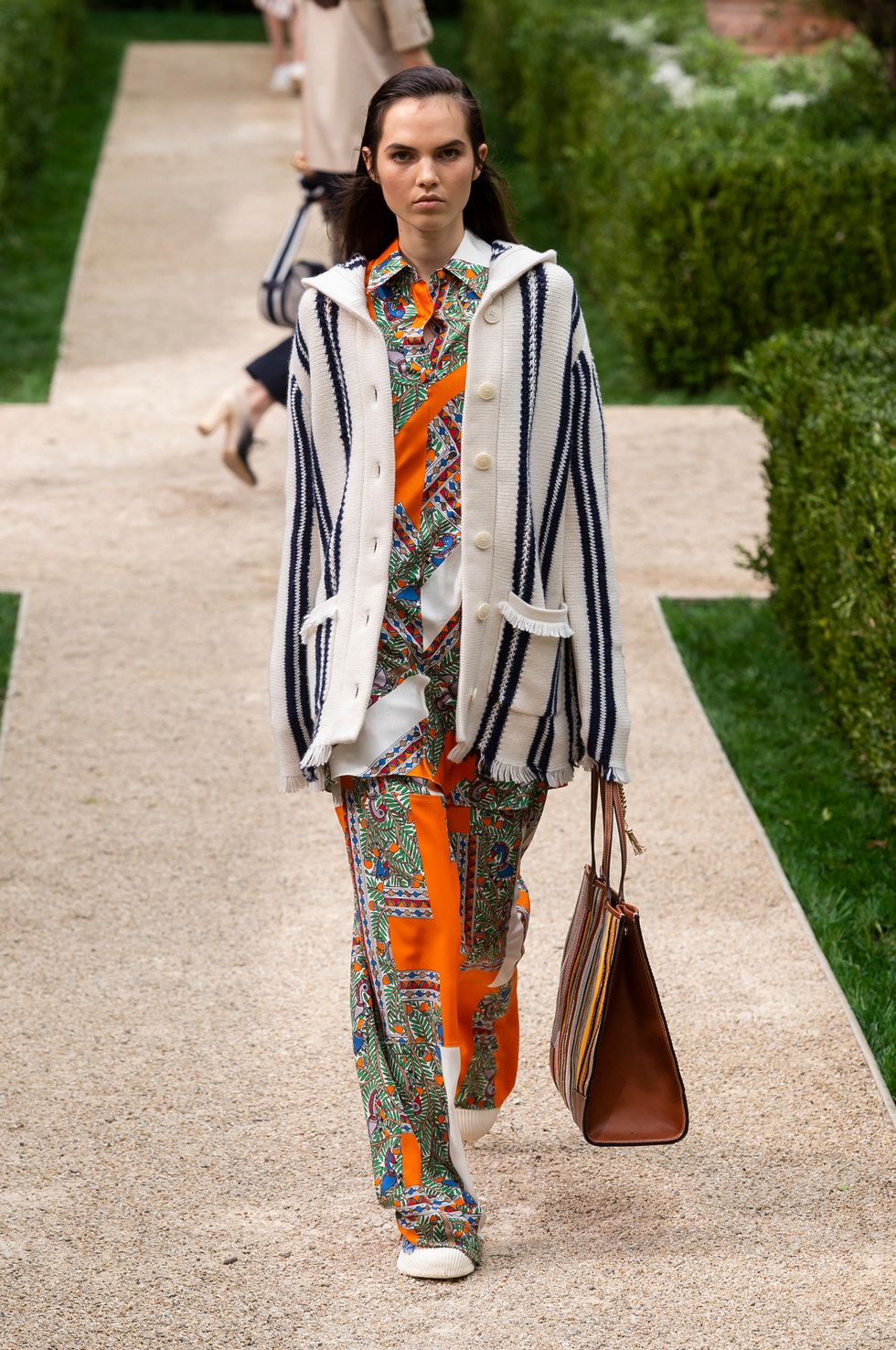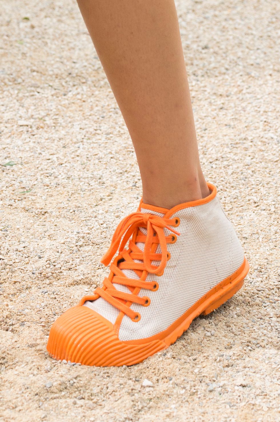 An array of footwear including lace-up booties with raffia heels covered in an ombre effect, easy sandals, perforated leather flats, and cream high-top sneakers punctuated with blue and orange laces and soles, went down the runway. On Tory's watch, a girl is prepared for any occasion.