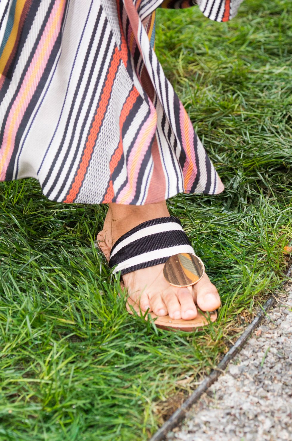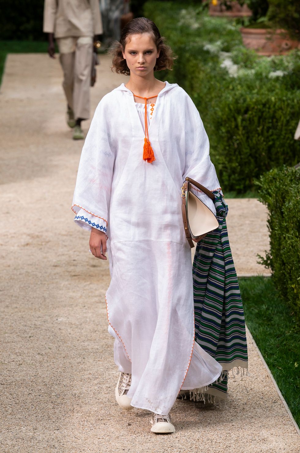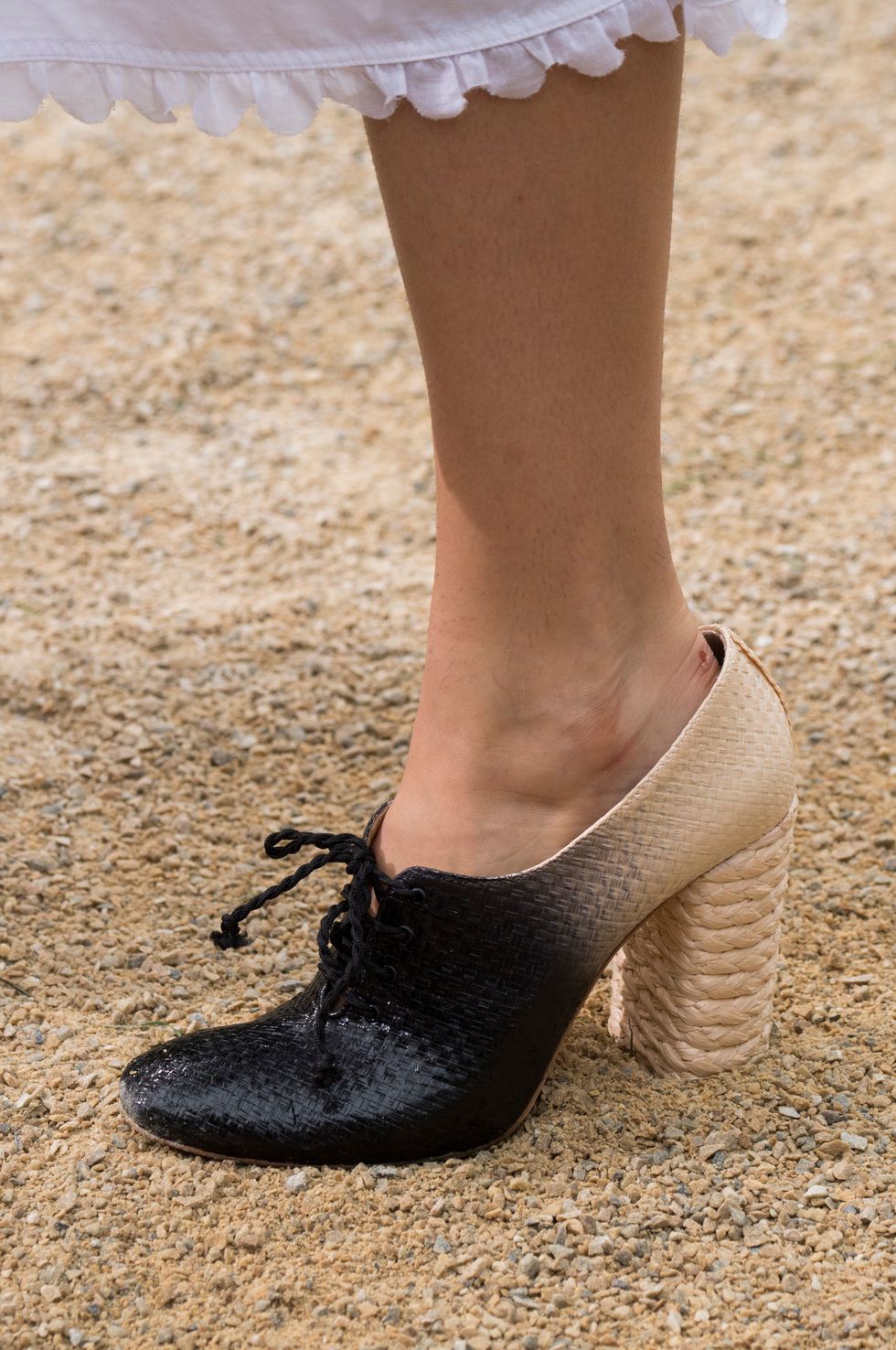 An array of footwear including lace-up booties with raffia heels covered in an ombre effect, easy sandals, perforated leather flats, and cream high-top sneakers punctuated with blue and orange laces and soles, went down the runway. On Tory's watch, a girl is prepared for any occasion.