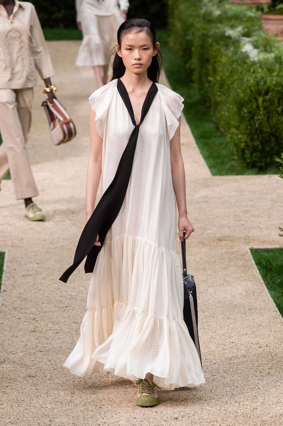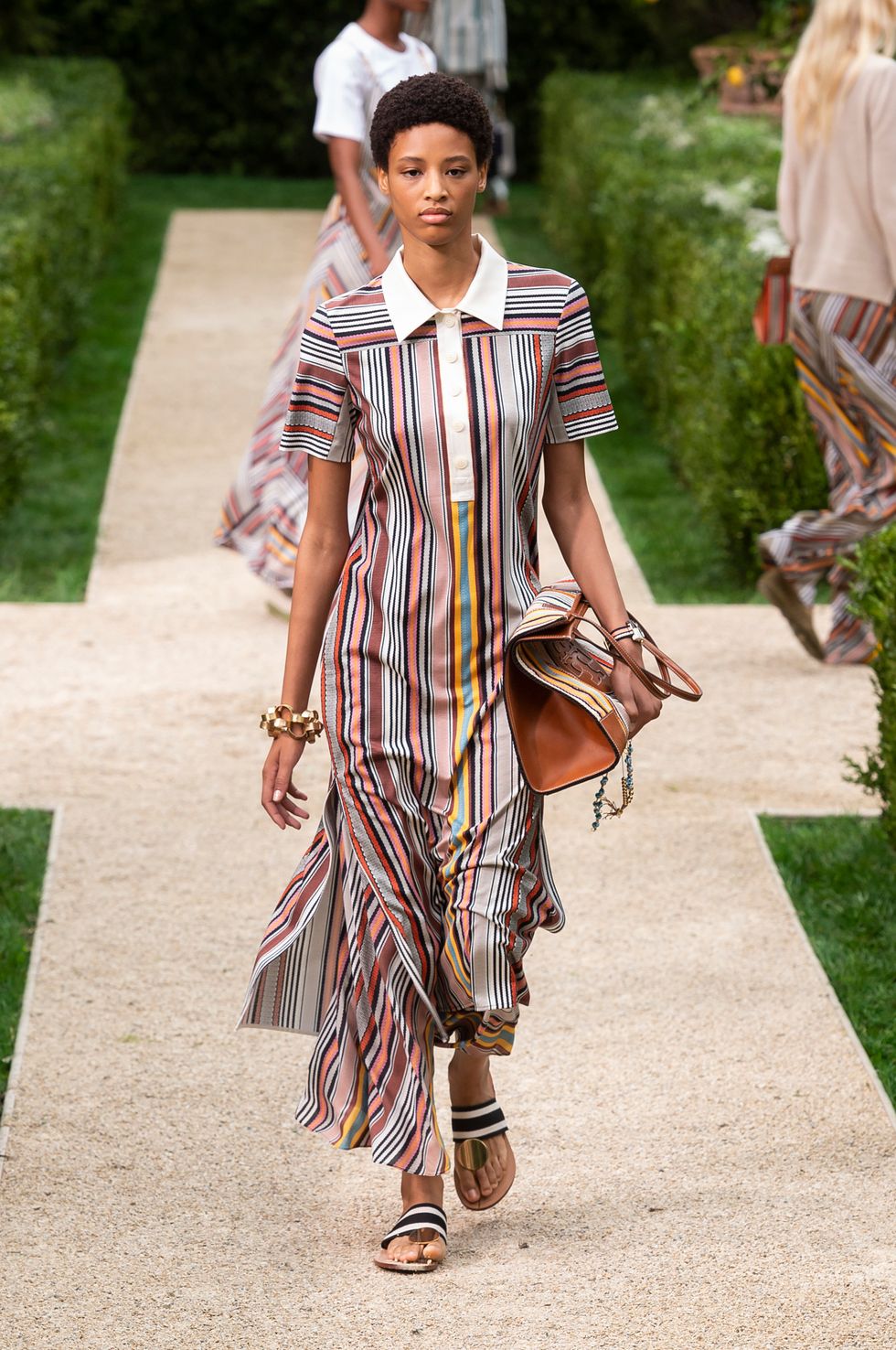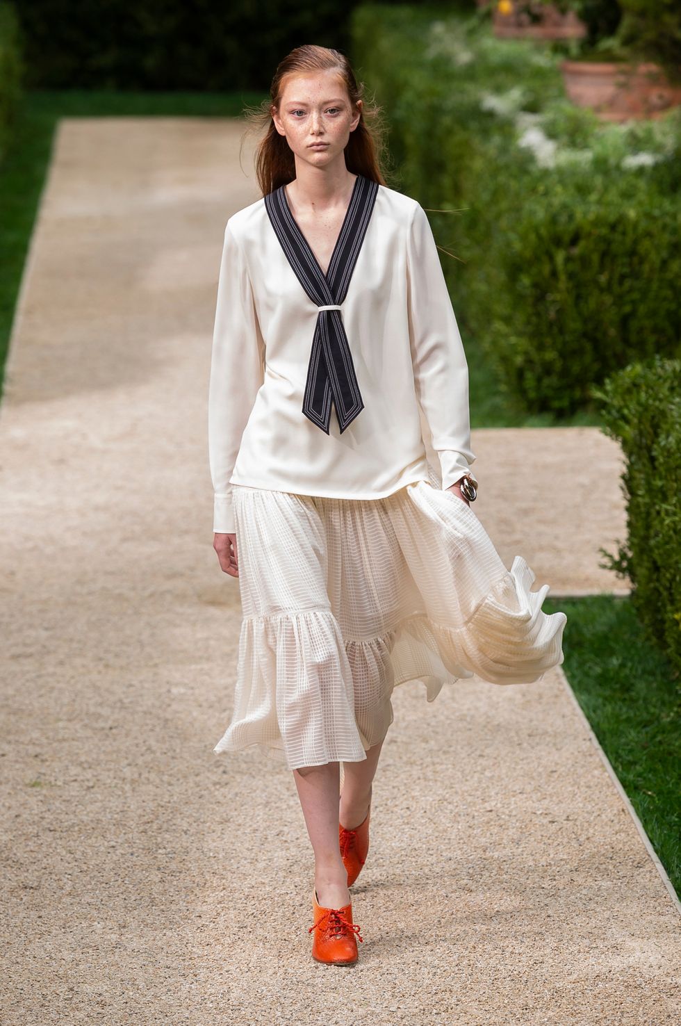 Tory Burch headed uptown to Manhattan's Cooper Hewitt Design Museum on 91st street for her spring 2019 show. Models strolled around potted lemon trees the institution's Arthur Ross Terrace and Garden adjacent to Central Park.