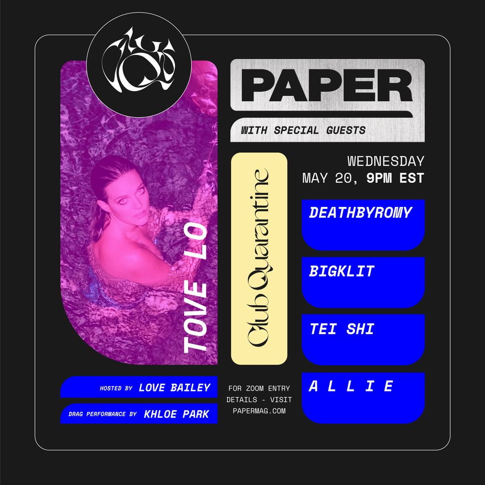 Yes, it's somehow Wednesday again, which means PAPER x Club Quarantine is back with another three-hour party featuring special guest DJs. Tove Lo, who released Sunshine Kitty in 2019, will close out the night in anticipation of her new song, "Sadder Badder Cooler," out May 22. DeathbyRomy is also celebrating a brand new track, "Kiss Me Goodbye," coming Friday, which follows her perfectly abrasive 2019 EP, Love u – to Death. BigKlit will drop by to guest DJ, fresh off her Trippie Redd collab, "Beautiful," in addition to Tei Shi, who's prepping a big 2020 project (Stream its lead single, "Die 4 Ur Love"). Finally, "Bet" singer A l l i e will come through the party, with a drag performance from Chicago queen Khloe Park.