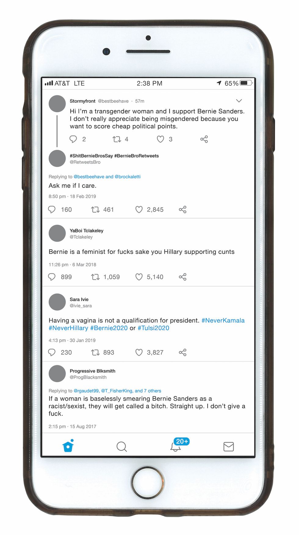 Staggers, like 92% of college-educated Black women, voted for Hillary Clinton in 2016. "The Bernie harassers were racializing their blame [targeting Black critics in particular], but then called themselves allies while demanding our loyalty to their candidate," she says. "It doesn't endear me to Bernie; it makes me avoid him at any cost." And while she remains firmly on the left, voting Democrat and still vocalizing her political beliefs online, Staggers does not feel safe online; her Instagram and Facebook profiles are private. She deletes, reports and blocks users who engage in abusive behavior. "I used to give my email address as a contact. I don't do that anymore."