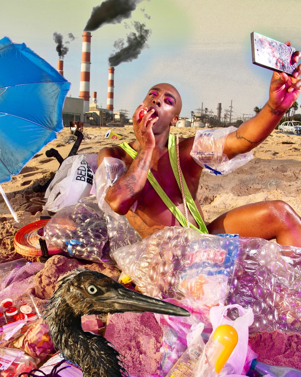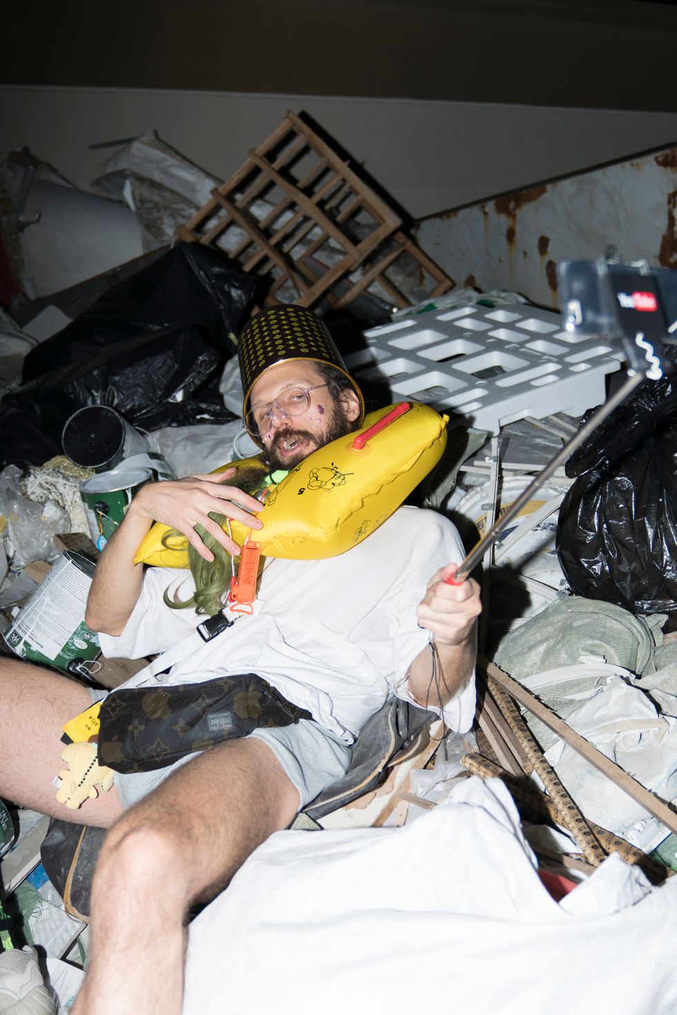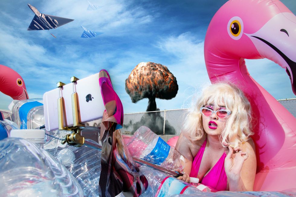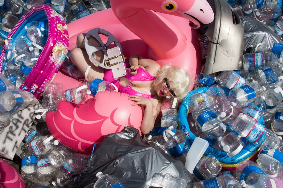 The colorful series takes an editorial-yet-humorous approach to post-apocalyptic selfie couture. Discarded Cheetos bags are fashioned into tube tops, a tennis ball is turned into a ball gag, and a flamingo floatie rests atop a sea of water bottles in this reimagined reality. The series' subjects seem indifferent to their various grotesque and abject states, caught up in a delirium intoxicated by their own vanity. "I feel like the hyper-consumerist life we are currently living must have a tipping point, that's what I'm interested in," Gransjean says.