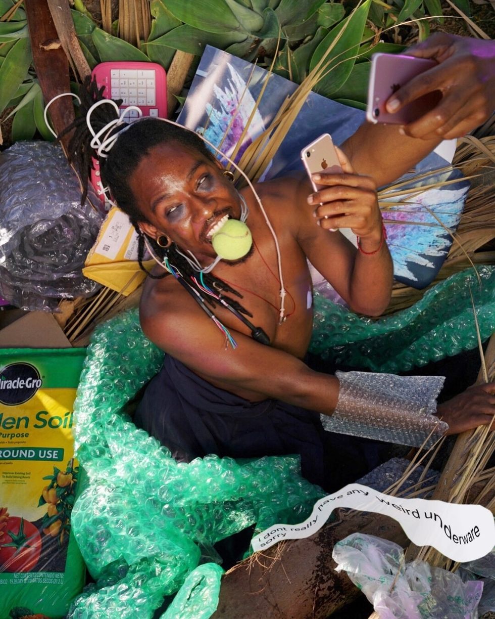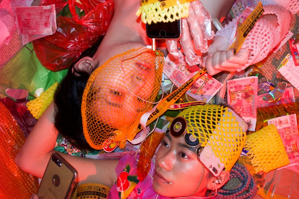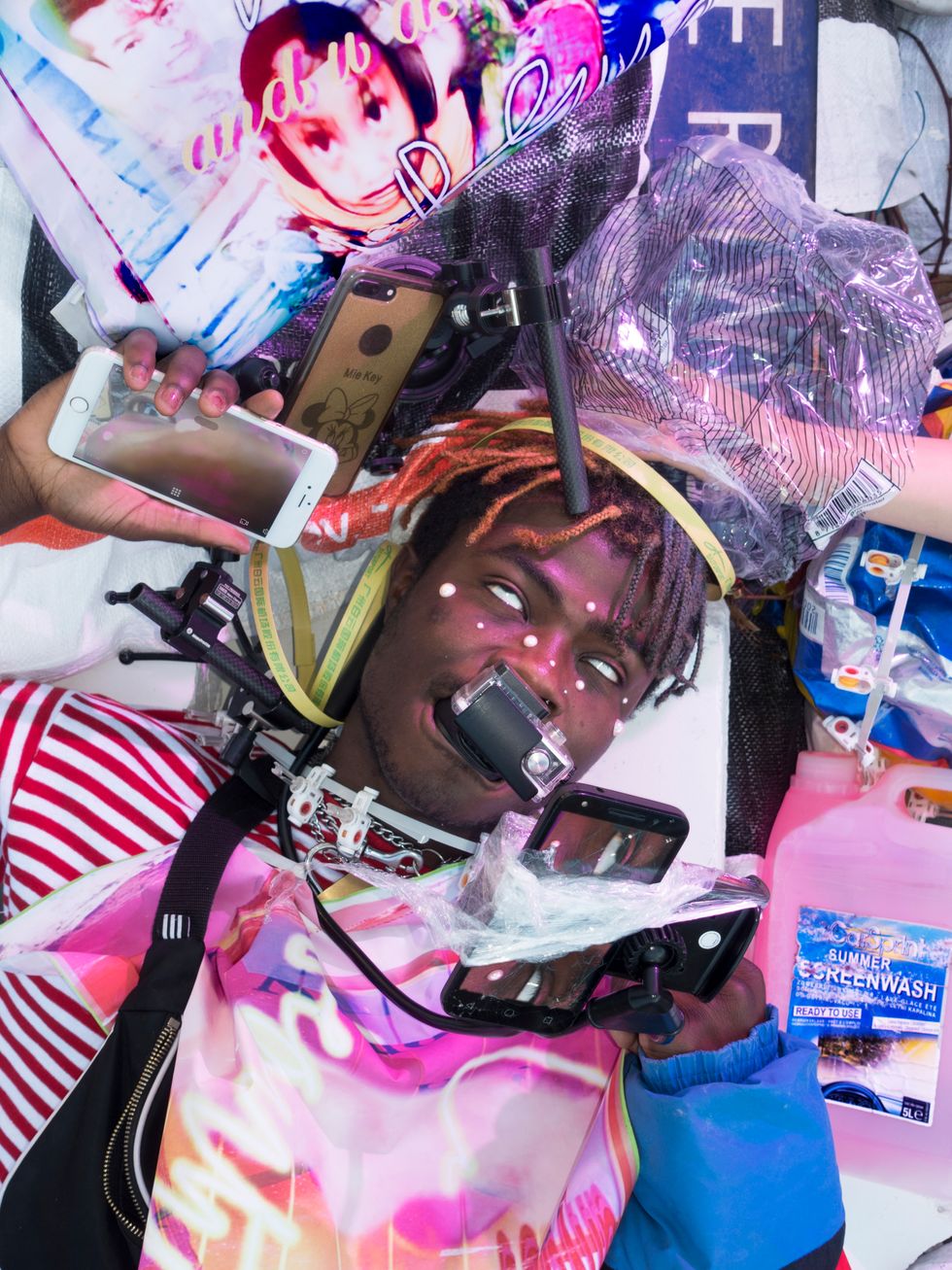 The colorful series takes an editorial-yet-humorous approach to post-apocalyptic selfie couture. Discarded Cheetos bags are fashioned into tube tops, a tennis ball is turned into a ball gag, and a flamingo floatie rests atop a sea of water bottles in this reimagined reality. The series' subjects seem indifferent to their various grotesque and abject states, caught up in a delirium intoxicated by their own vanity. "I feel like the hyper-consumerist life we are currently living must have a tipping point, that's what I'm interested in," Gransjean says.