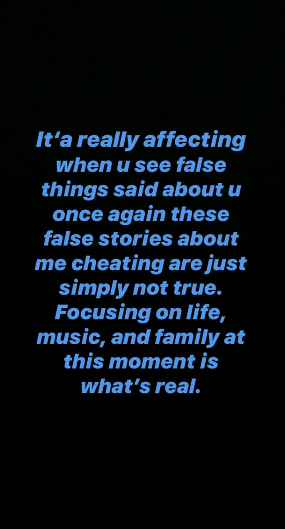 "It's really affecting when u see false things said about u once again these false stories about me cheating are just simply not true," Scott wrote. "Focusing on life, music, and family at this moment is what's real."