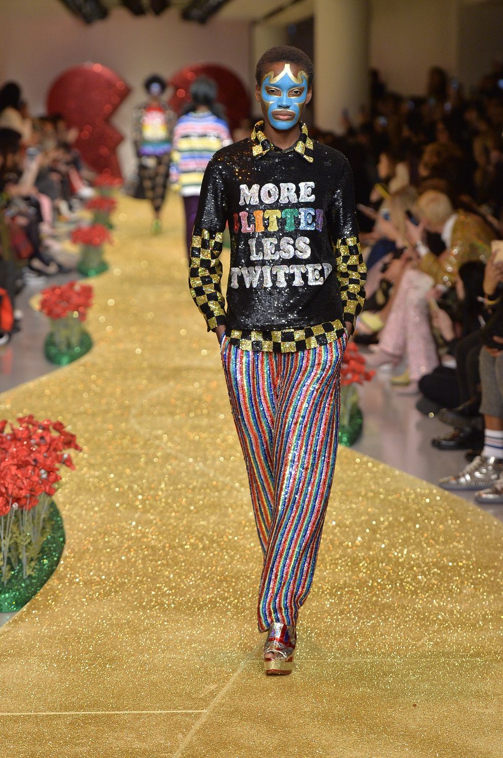 The surreality of the current political moment in America is nothing short of a L. Frank Baum fever dream (ok, nightmare). So it was apt for Ashish Gupta to set his witty and glittery fall show on the yellow brick road we all know so well. The original Oz was an allegory for the politics and social movements of the 20s and 30s and Ashish mashed up those references with our current vocab: Nasty Woman and Pussy Grabs Back t-shirts. A recurring slogan throughout, one that we could all do well to remember in the daily barrage of breaking news and calamity: More Glitter, Less Twitter.