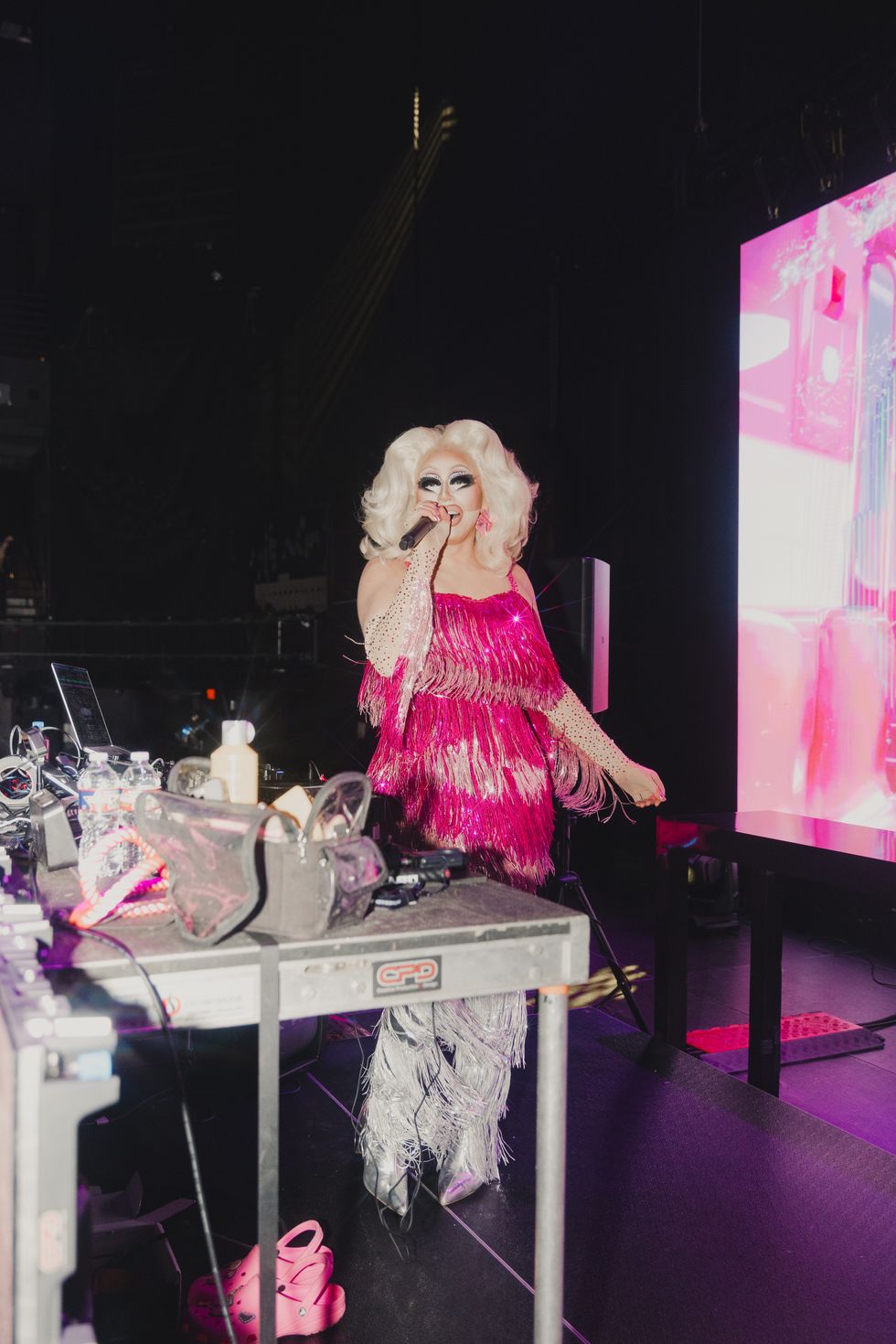 For me it was sophomore year of college, smoking weed on a shitty futon in 2015 while she got dressed up like flight attendant Barbie, and then in person almost a decade later, while working on PAPER’s cover story with Chappell Roan. Others met her in Chicago and Milwaukee gay clubs, years before she hit the main stage, or on the wildly successful, first-of-its-kind YouTube series UNHhhh with longtime collaborator Katya, or on subsequent seasons of the hit drag television show. The list keeps going: The Bald and the Beautiful, a critically acclaimed Queerty-winning documentary, on tour with Katya, elsewhere on YouTube’s Mattel-ian algorithm and most recently, behind the DJ booth at her globe-trotting dance party, the femininomenon-al Solid Pink Disco.