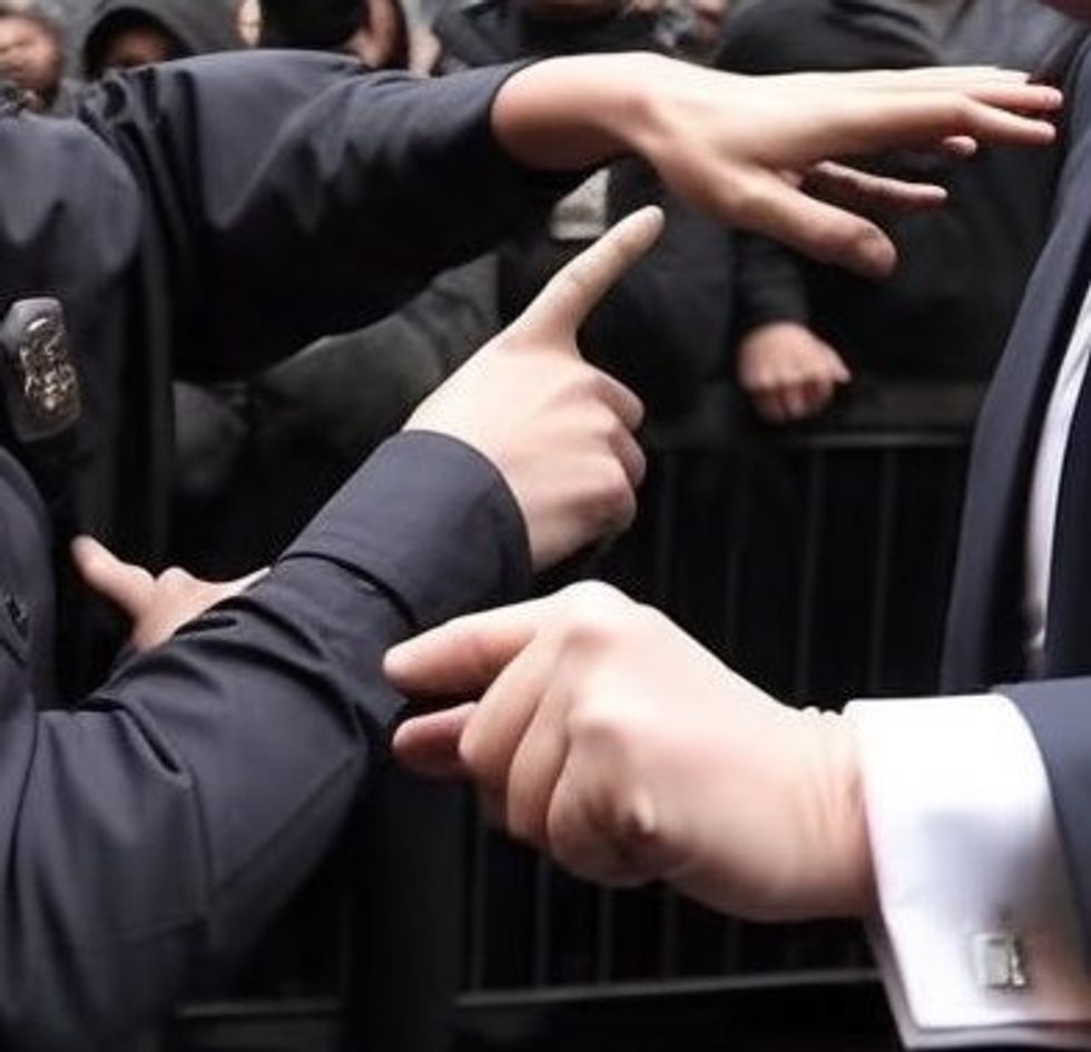 Some of these photos are fairly convincing, but a telltale sign that the photos are fake is to look at the hands. Especially in Higgins' photos of Trump appearing to be taken down by a group of police officers, some appendages don't make sense or just look slightly off.