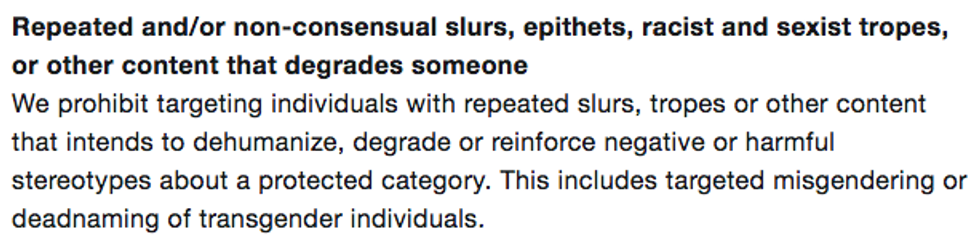 In late October, Twitter quietly updated its rules to explicitly address rampant trans harassment. Last week, users started to take note after PinkNews and other sites reported on the changes. The social media giant now explicitly prohibits the transphobic practices of deadnaming (deliberately using a trans person's previous name) and misgendering.