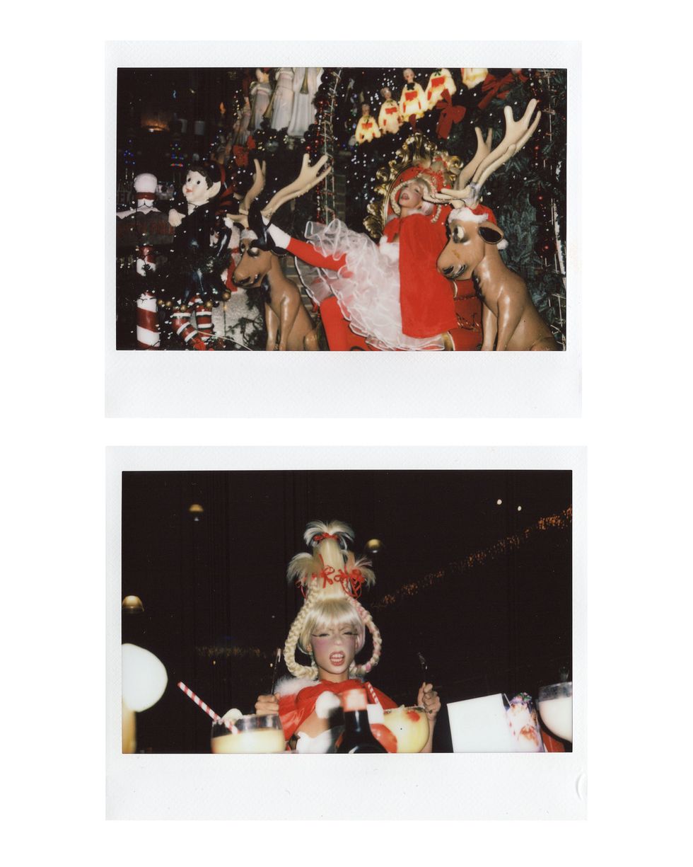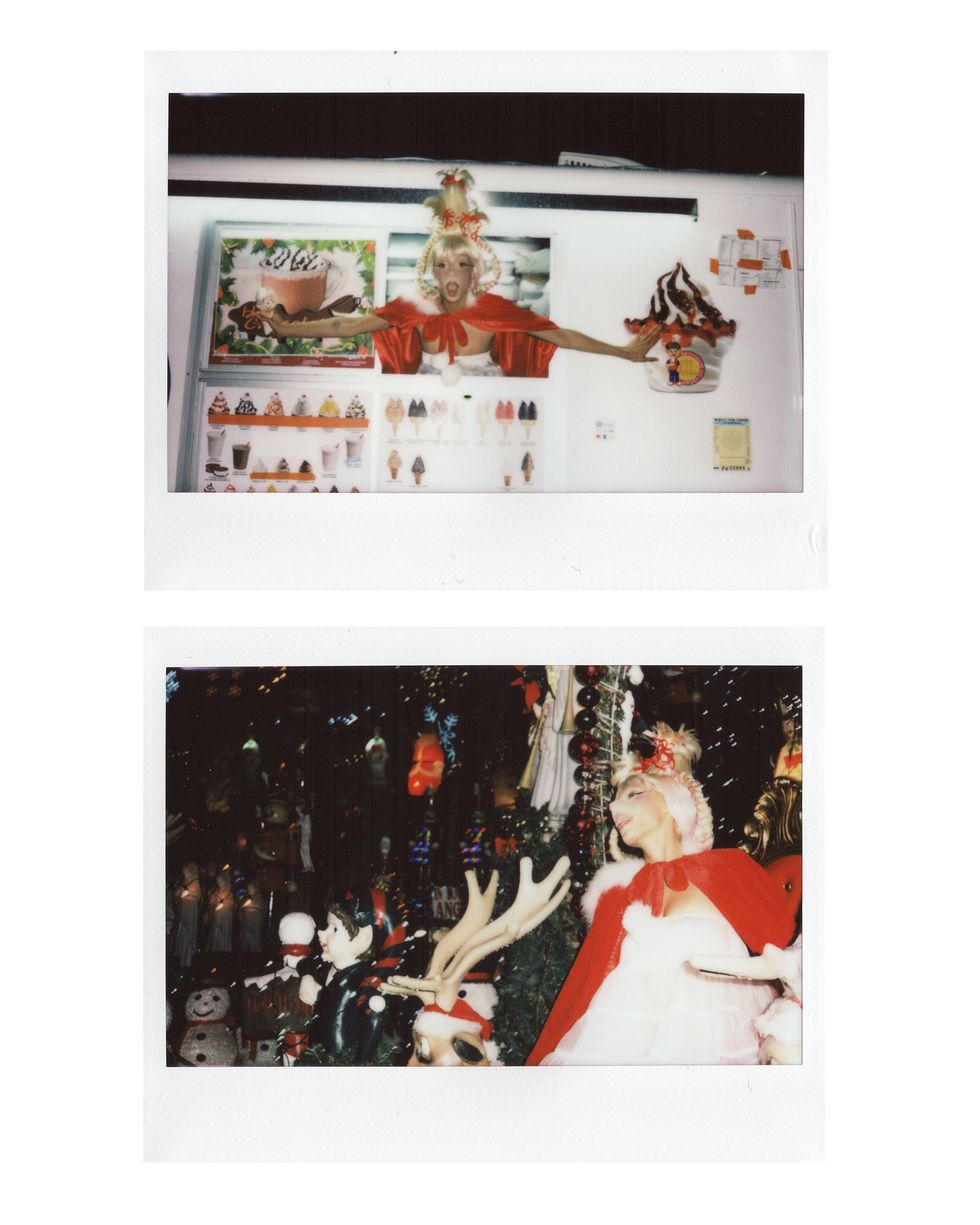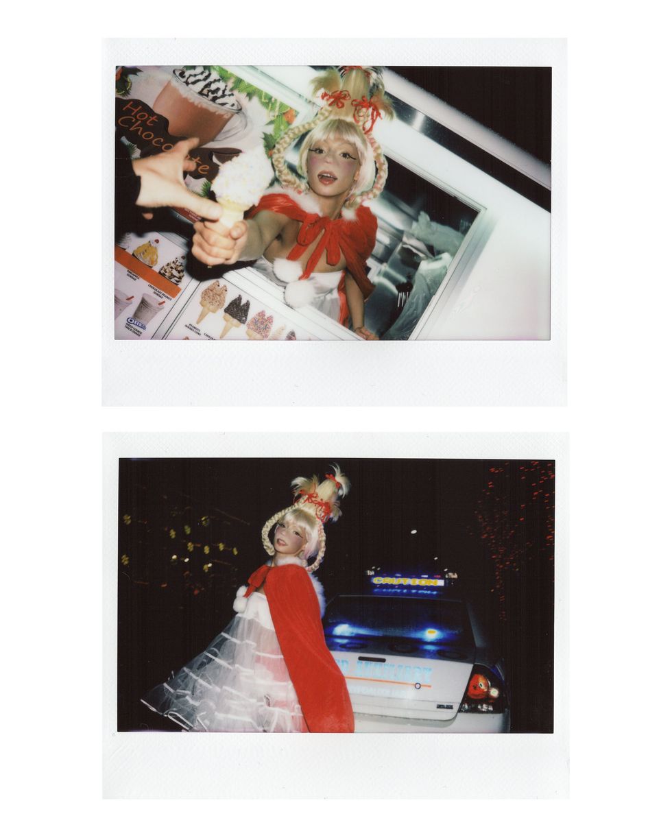 It's Christmastime, and our fave model @uglyworldwide (AKA Jazzelle Zanaughtti) is feeling more naughty than nice. She presented us with this series of cursed-yet-festive images of herself dressed as an all-grown-up Cindy Lou Who from How the Grinch Stole Christmas. Well, she's wearing Cindy's iconic blonde pigtailed wig at least.