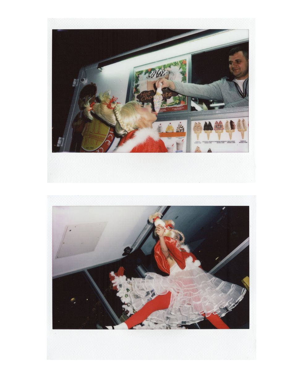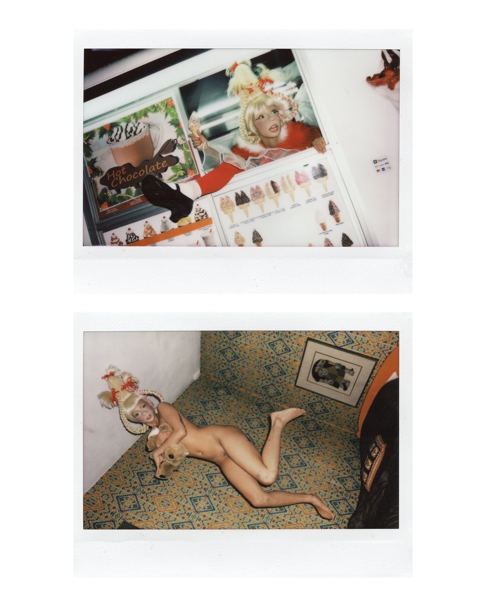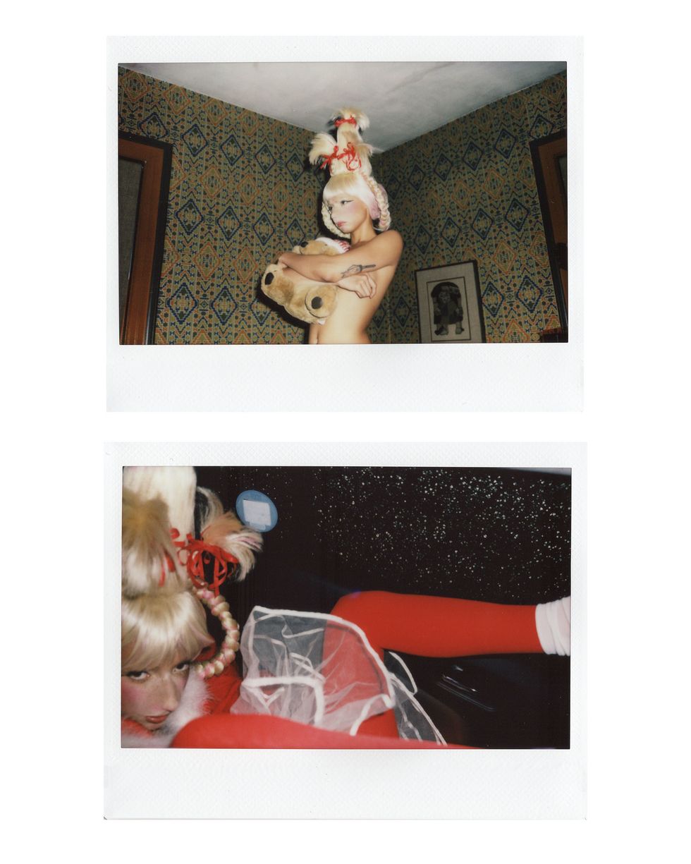 It's Christmastime, and our fave model @uglyworldwide (AKA Jazzelle Zanaughtti) is feeling more naughty than nice. She presented us with this series of cursed-yet-festive images of herself dressed as an all-grown-up Cindy Lou Who from How the Grinch Stole Christmas. Well, she's wearing Cindy's iconic blonde pigtailed wig at least.