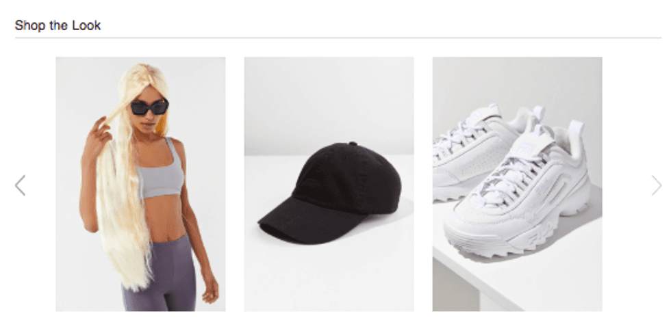 The sunglasses, sneakers and wig are sold separately. Only the wig is actually filed under the site's "Fun + Games" section, while the $70 FILA white ugly-sneakers, $10 black canvas baseball cap and $14 "Gigi Slim" tiny sunglasses (clocking in at $150 for the full ensemble) recommended to complete the look are actually just everyday Urban Outfitters merchandise. The page also links to shoppers to nearly identical, non-costume sports bra and leggings.