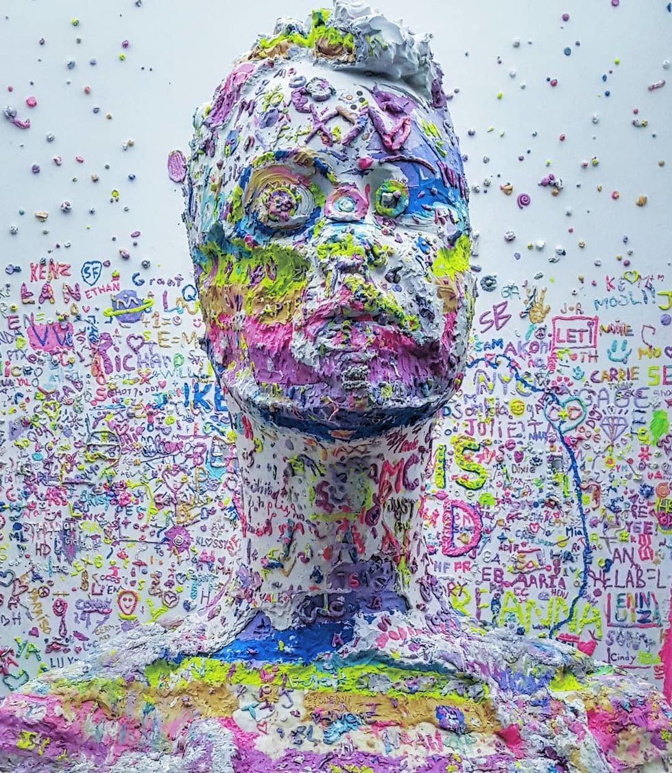 He recently rendered Katy Perry in malleable modeling clay, and then invited the public to modify or defile the bust with colorful clay at a viewing space in Soho (the show was in collaboration with Perry around her 2017 album Witness). By the end of the show, Katy had graphic chunks ripped out of her collarbone, rainbow cheeks, a terrifying animal animal affixed to her nose, and hundreds of names and symbols carved in her like a tree.