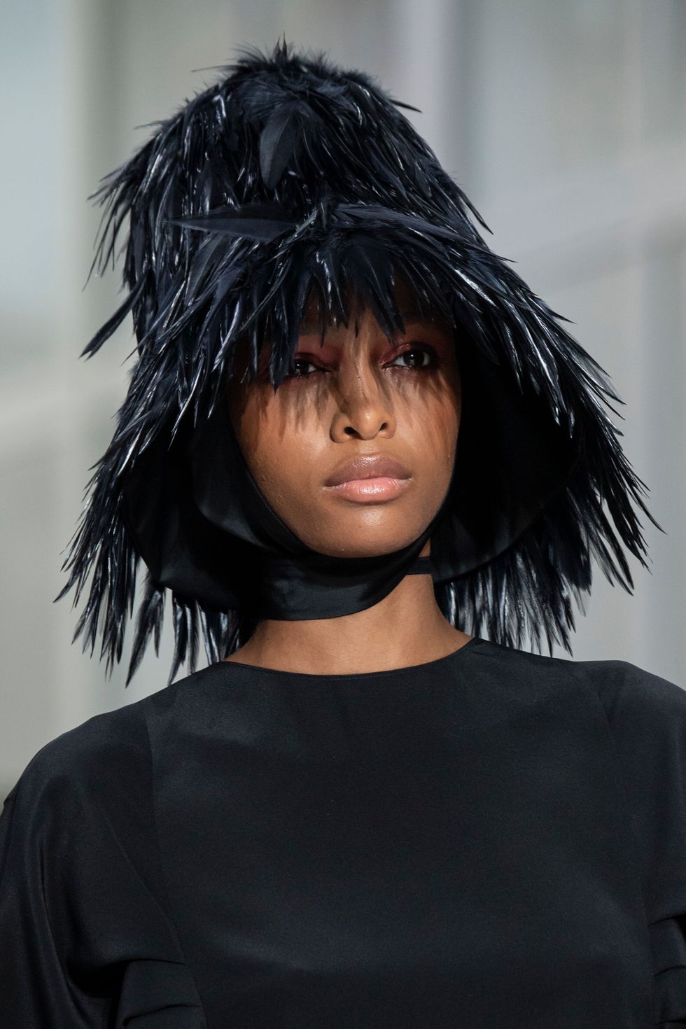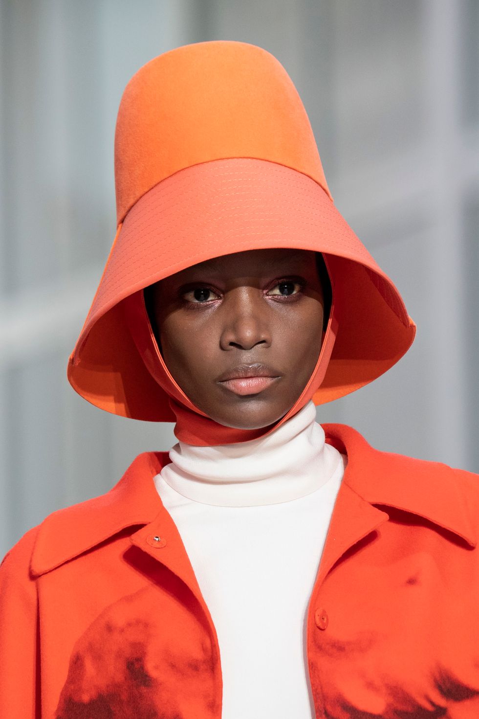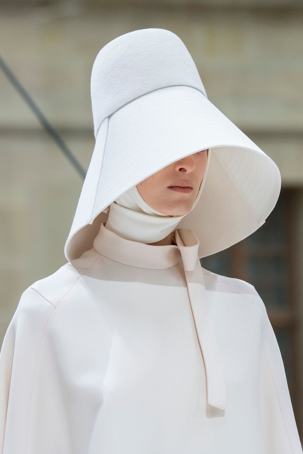 Following fashion's obsession with hats, the label sent models out on the runway topped with tall, modified, structured bucket hats that sometimes veiled the face.
