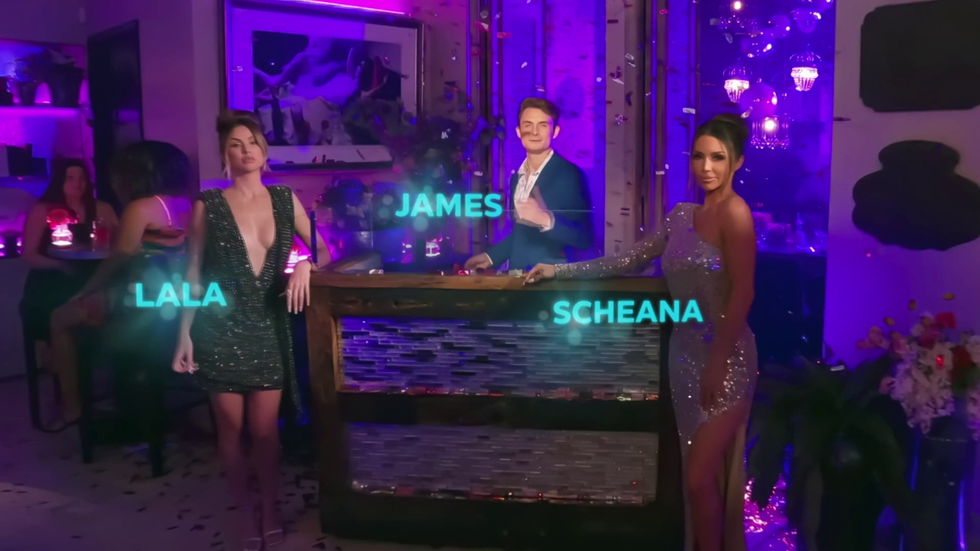 Oh, brother. Isn’t it interesting that Lala is always dressed like a bottle girl in these opening sequences, while Scheana is dressed like the fifth runner up in the Little Miss Toluca Lake Pageant? I actually like her dress to be clear! It’s just an interesting contrast, considering they’re sat up in a restaurant that none of them work at. (Except James, in a weird way.)