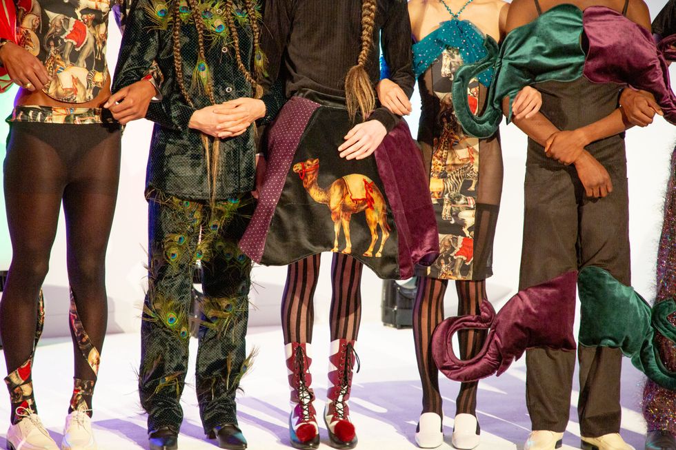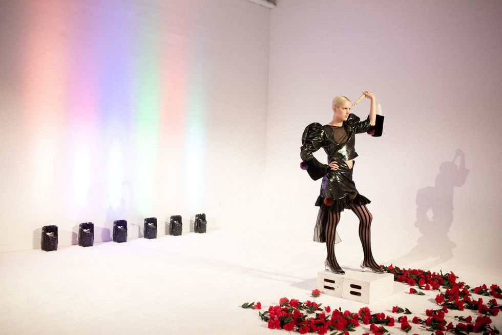 Though he typically stages his show during the menswear portion of NYFW, the designer isn't limited to gender stereotypes and often creates pieces for everyone — with concepts that usually make the viewers really question things. "I wanted to play with that concept and create an allegory of how the performer, the trainer and the viewer interact with one another. This functions as a symbol of these roles we are assigned in society."