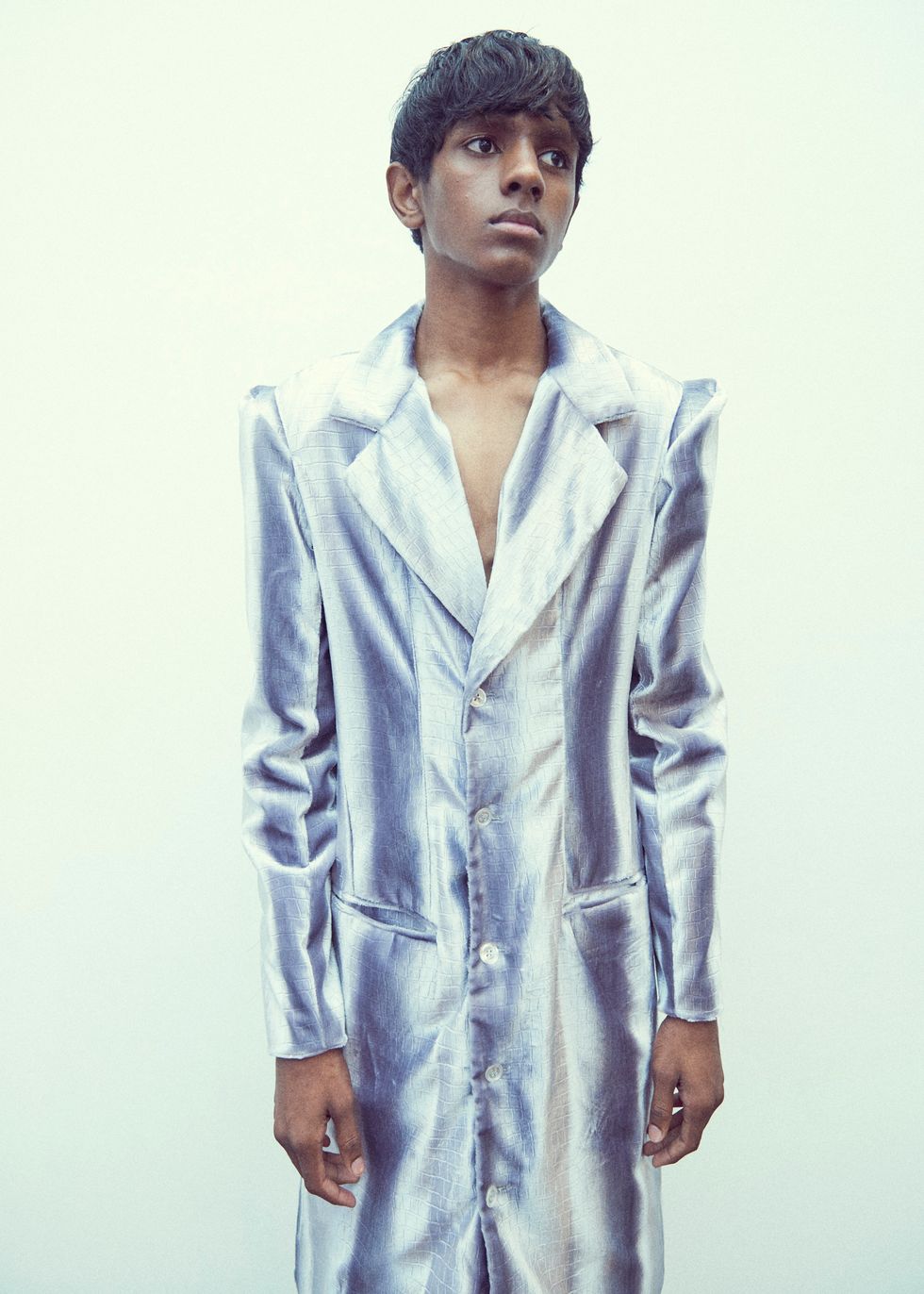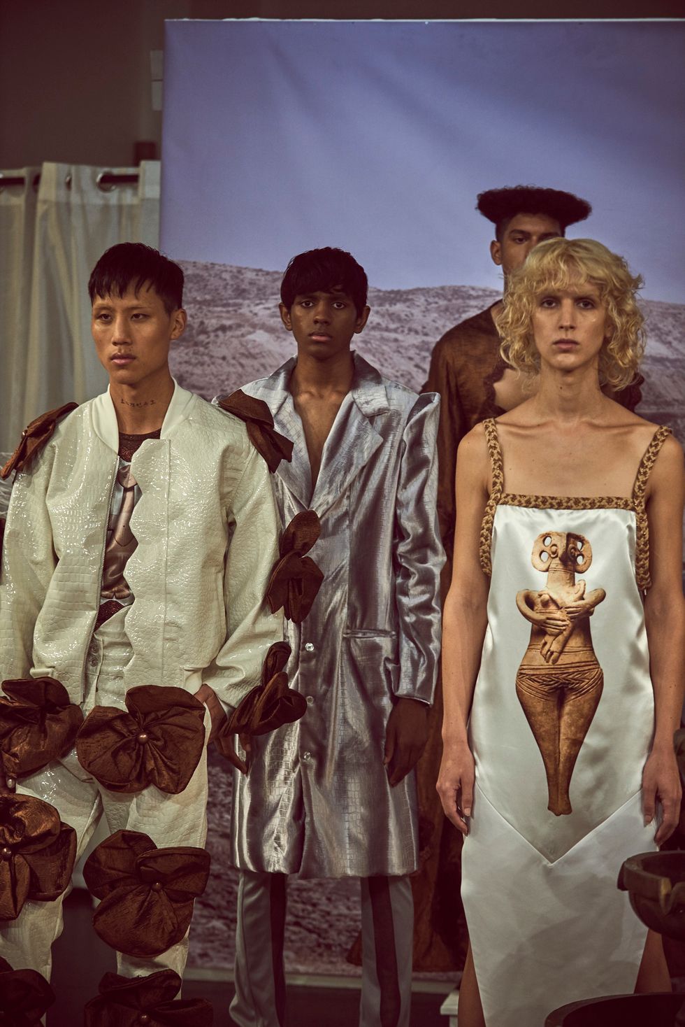 And the designer, who has dressed the likes of queer icon Jake Shears, showed gleaming silks and baroque brocades in neutrals, seafoam, and lilac, on a diverse cast. The models were set against a background with an image of the Cyprus beach where, legend has it, the goddess Aphrodite was born. And several looks were printed with those ancient sculptural works – as Loizides put it, "both the soul and the figurines have withstood death."