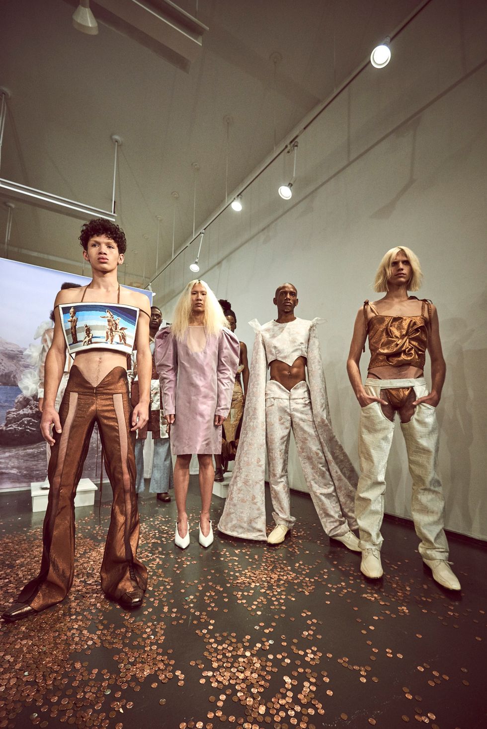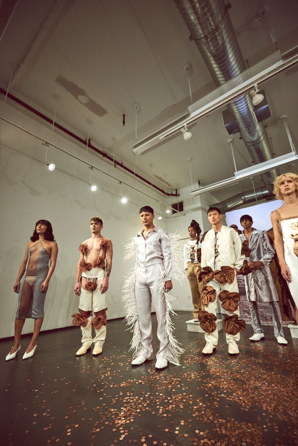 Multiple pieces were trimmed with large copper-colored poppies; in Cyprus, poppies signify an "eternal sleep," and copper trade is essential to the history of the island (the word "Cyprus," in Latin, actually means copper). The floor was littered with pennies.