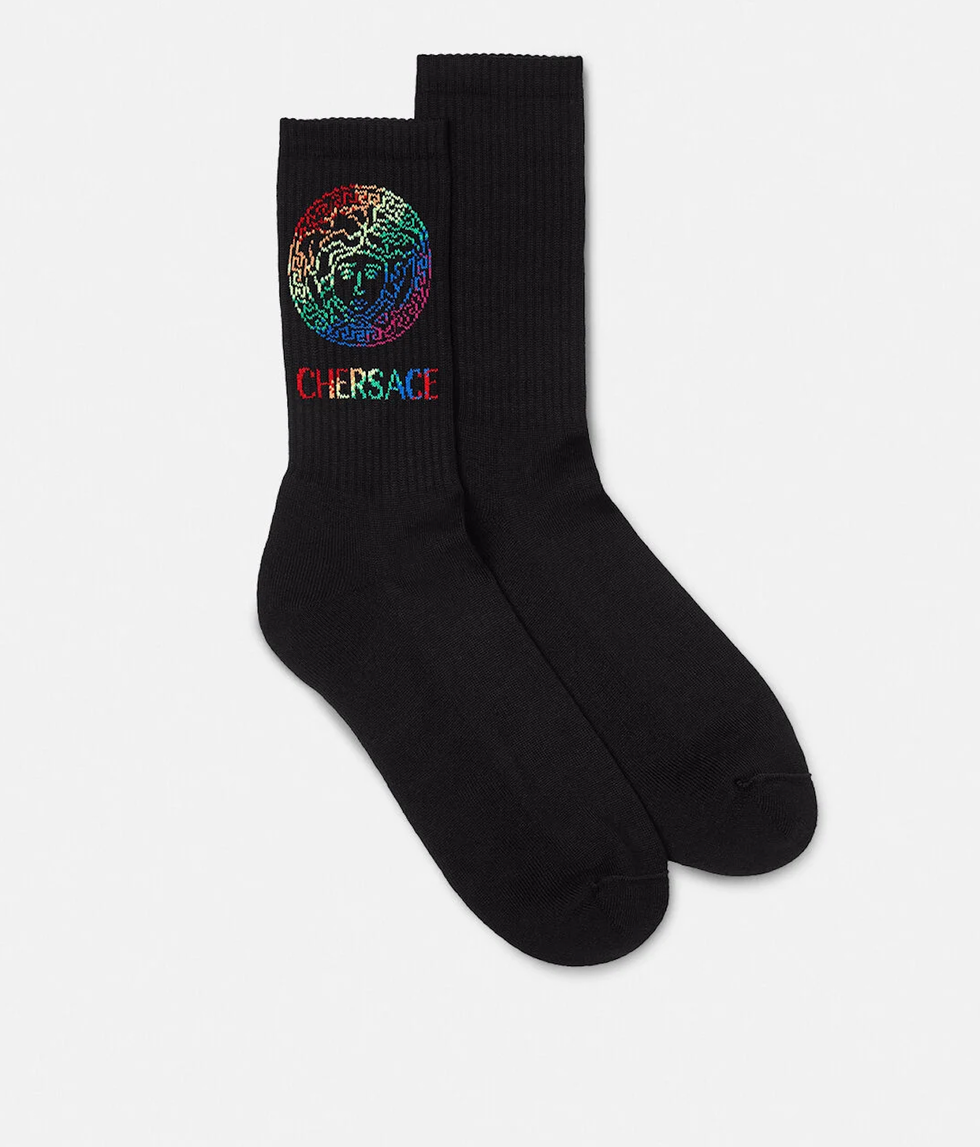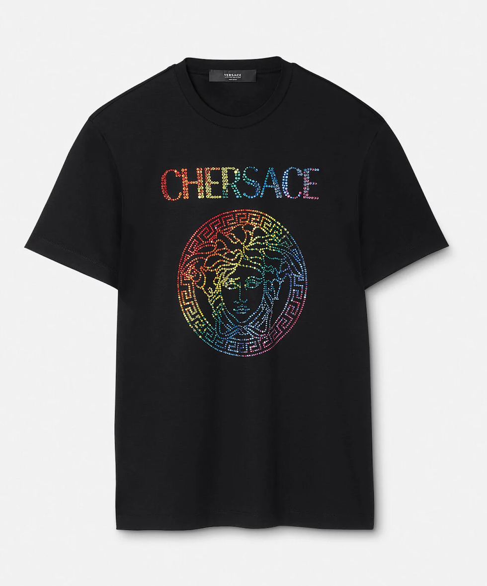 After teaming up with Lady Gaga and her Born This Way Foundation for a Pride capsule last year, Versace is once again going with another gay ally and icon. The "CHERSACE" capsule is simple enough — black t-shirts, socks and a cap emblazoned with the rainbow Medusa medallion and logo — though, if you really wanna go all out, there's a t-shirt that's diamante-embellished if you can cough up $3,350 (the rest are all under $500).