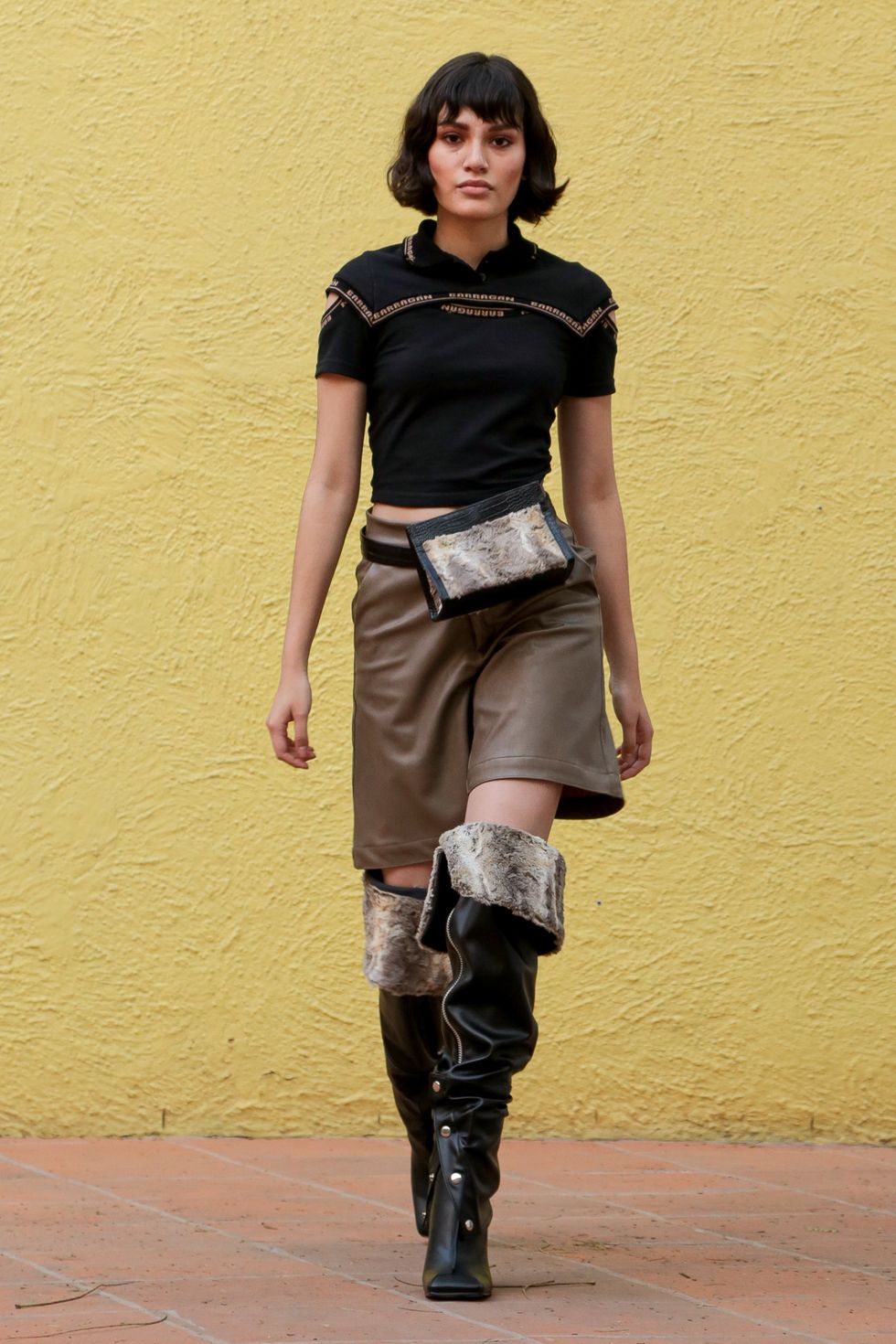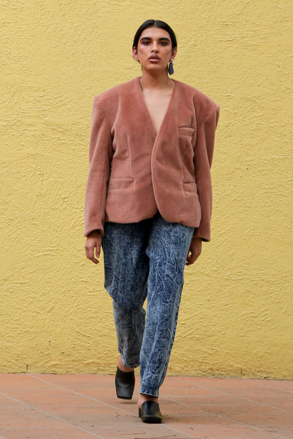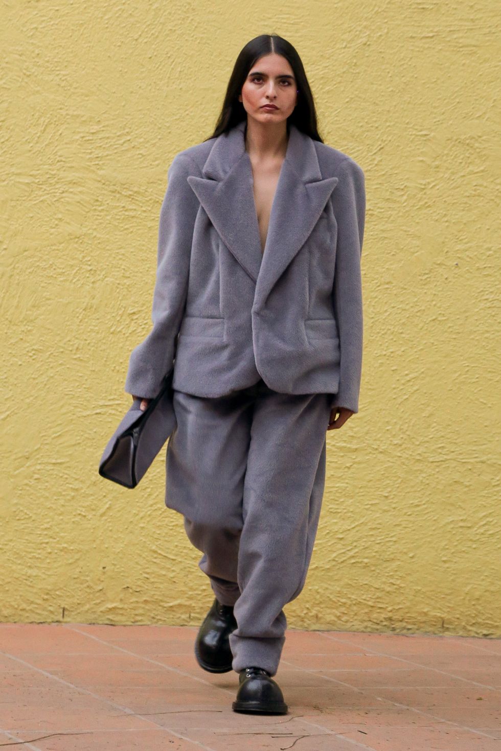 Besides lace, leather, and denim pieces, textures veered toward the cuddly – broad-shouldered suits, blazers, sleeveless coats, and a winter gown looked soft as teddy bears, and several pieces, including '90s erotic thriller-style thigh-high boots, were trimmed with a chinchilla-like faux fur. Barragán "wanted a warm contrast to the very sexy lace pieces. After all, it is a Fall/Winter collection." But not too warm – one faux fur cocktail dress included underboob cut-outs.