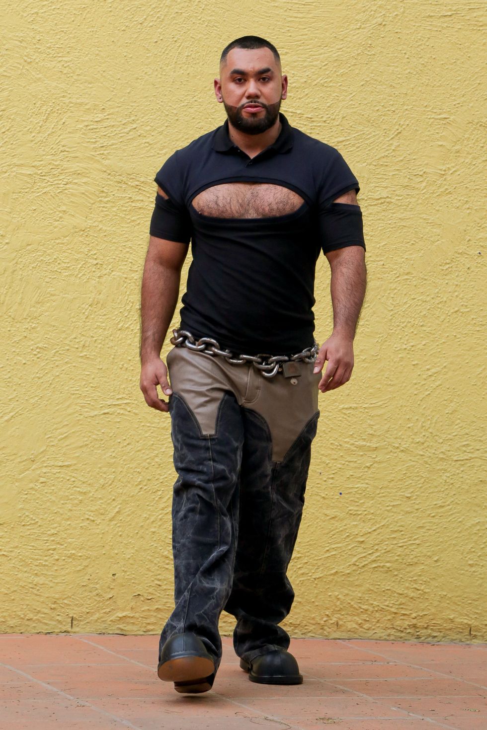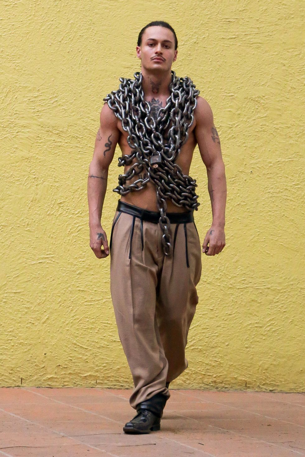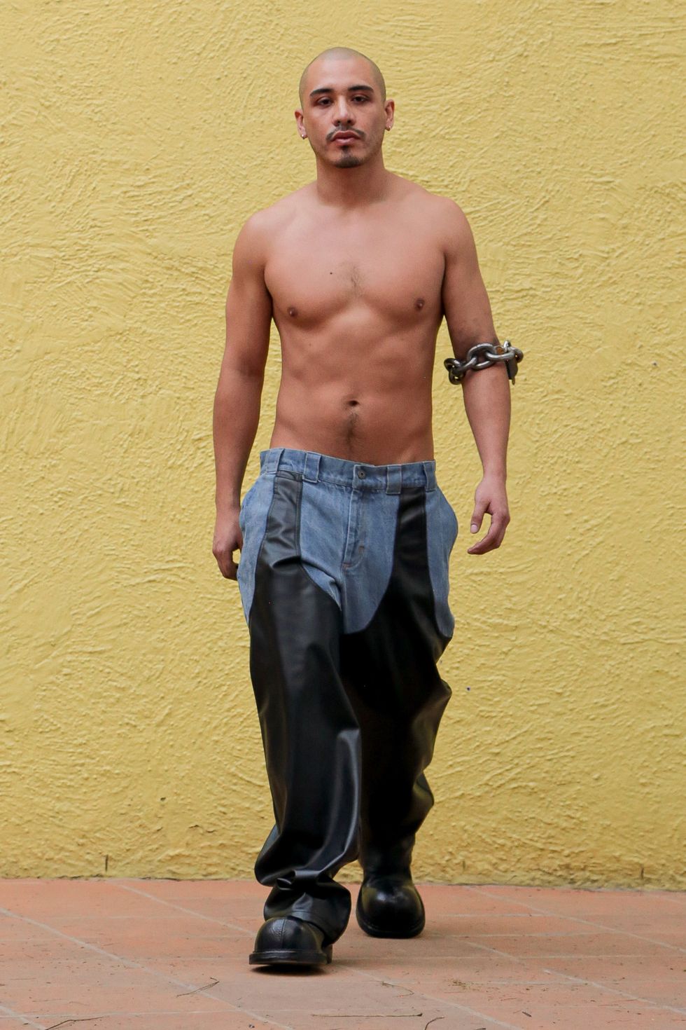 But Mexican culture – and Mexico City's intrinsic hipness – has always been essential to his work. This season, Barragán titled the collection "Brujería," and the severely well-constructed garments were inspired by witchcraft and the occult. Sheer, nipple-revealing lace and heavy chains, worn at the neck and waist, abounded; the models looked prepared for ritual, magic both black and white. The clothing, styled by frequent collaborator Tess Herbert, was also gloriously sexual: unexpected, angular cut-outs (often at the chest, or, in the case of one particularly excellent pair of trousers, the knees), huge low-rise jeans with leather daddy signatures, dangerously low necklines, and beautifully tailored suits styled without shirts underneath.
