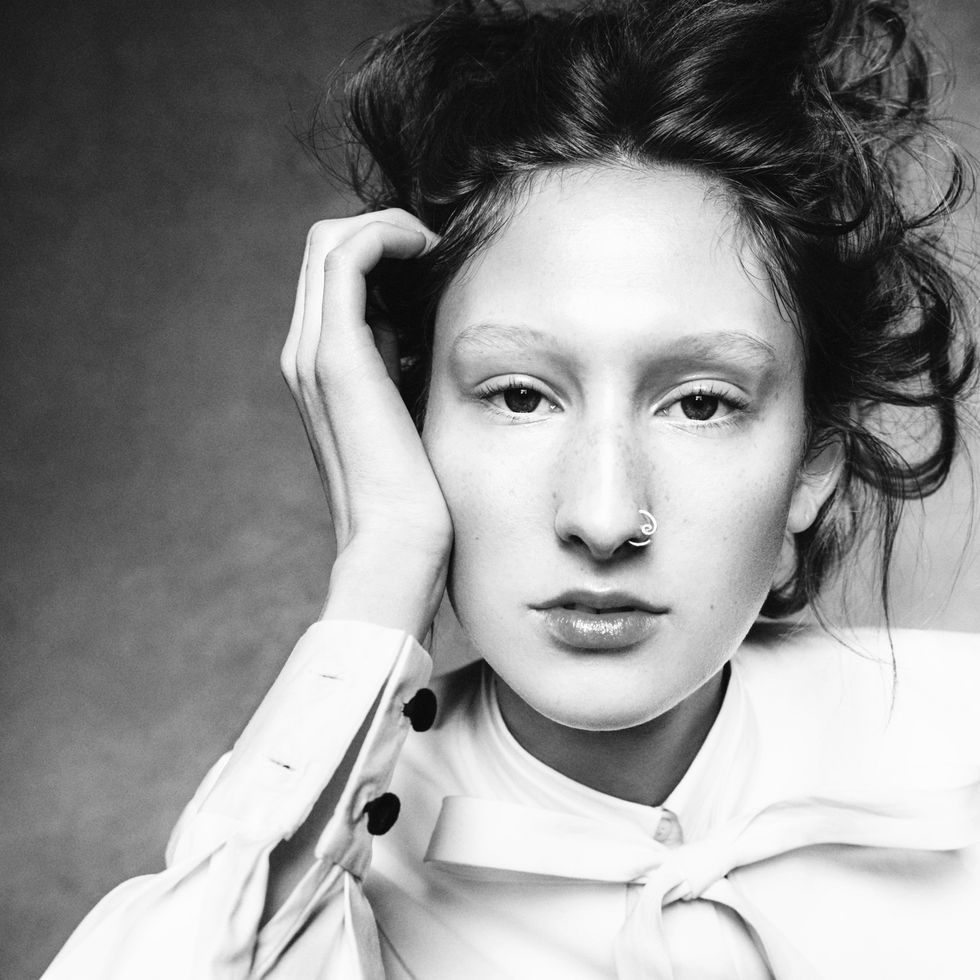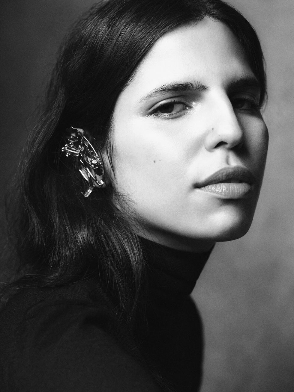 Hayett McCarthy wears an earring by Loewe and a sweater by Christian Dior