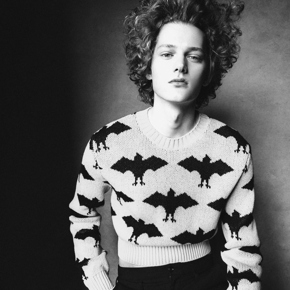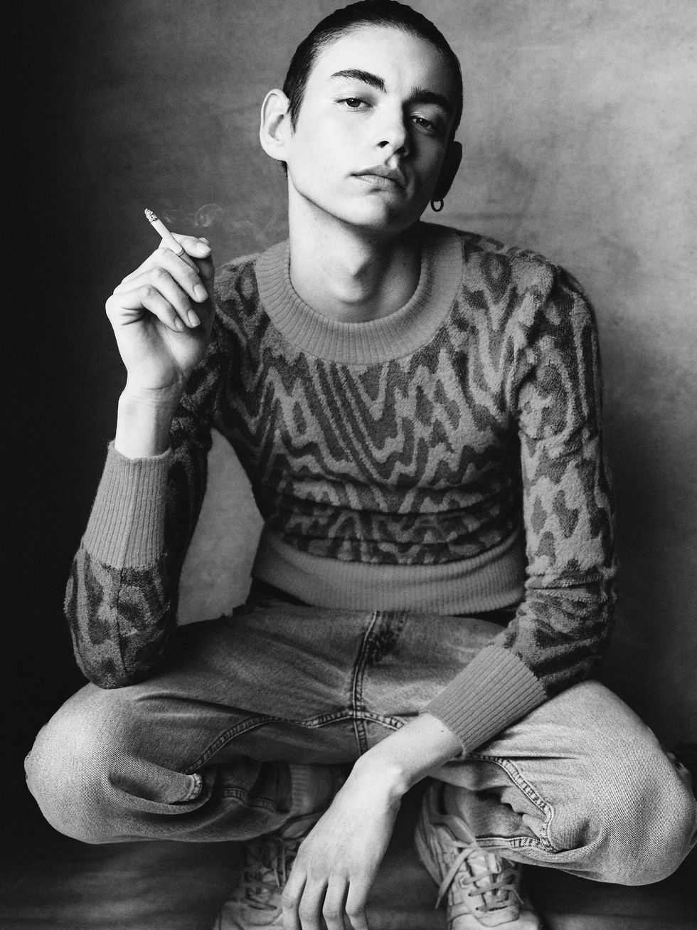 Dylan Christensen wears a sweater by Missioni, jeans by Levi's and shoes by Reebok