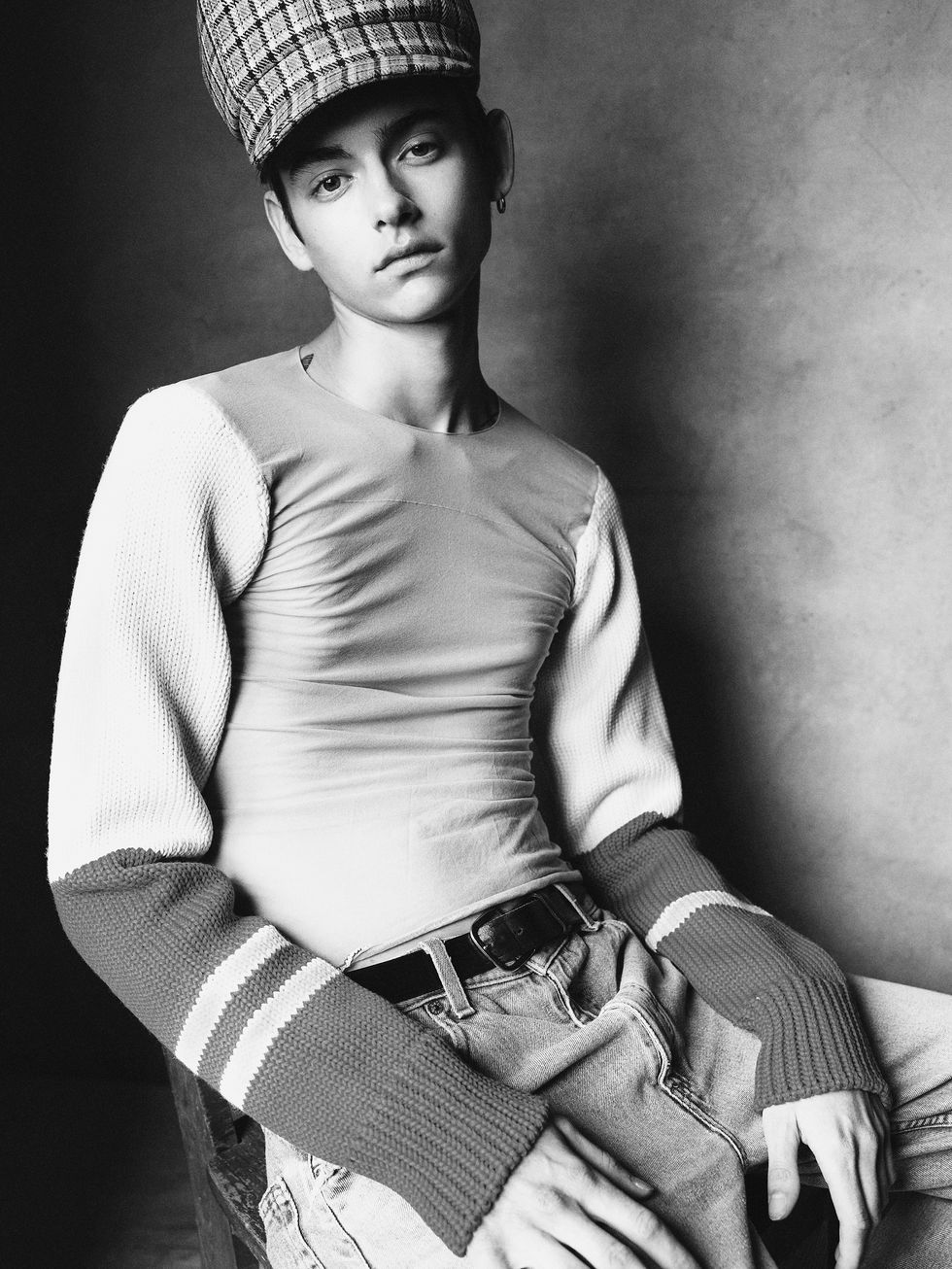 Dylan Christensen wears a hat by Marc Jacobs, a sweater and belt by Calvin Klein, jeans by Levi's and an earring by Christian Dior