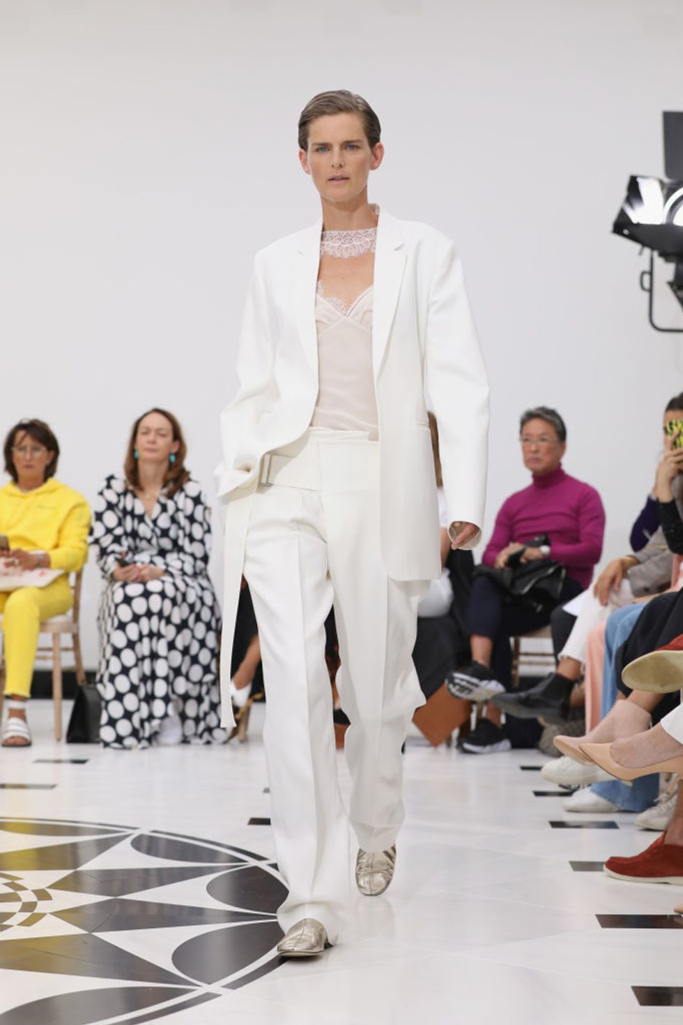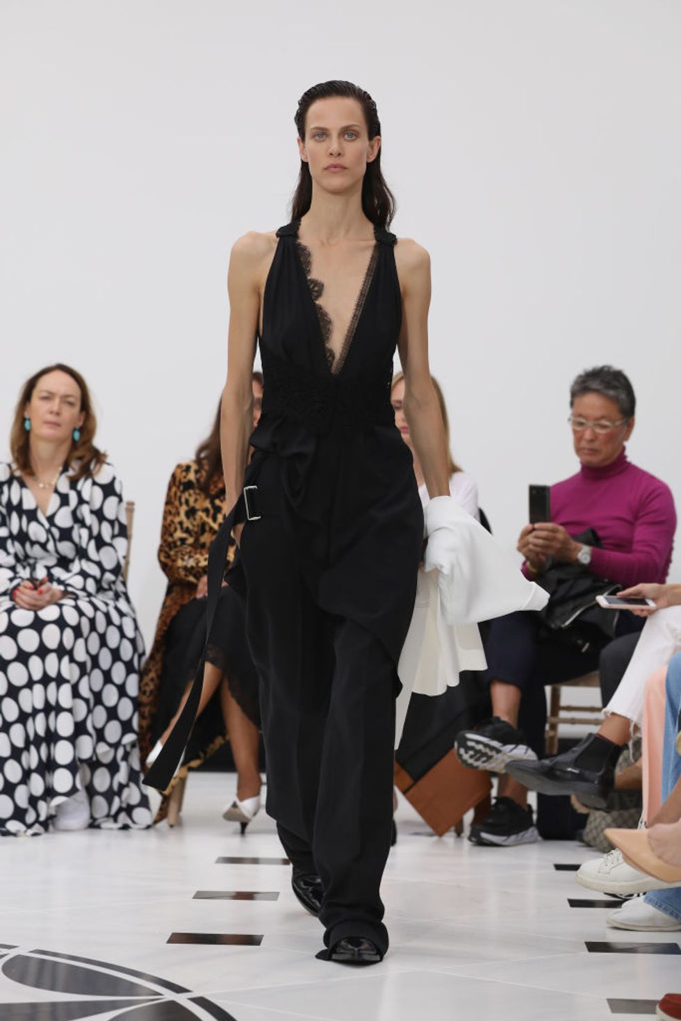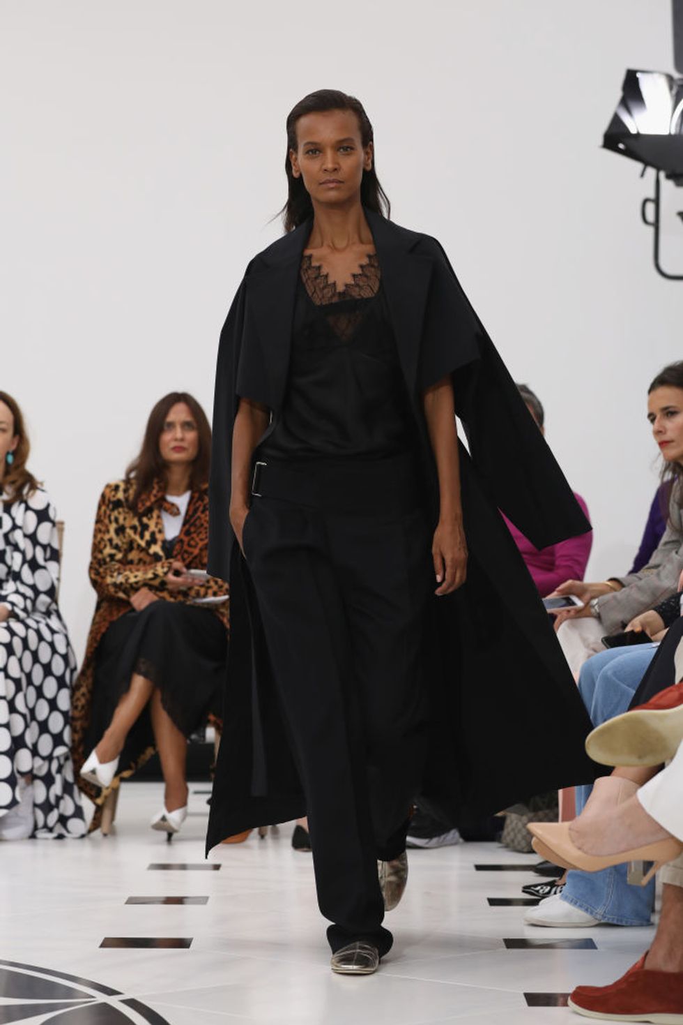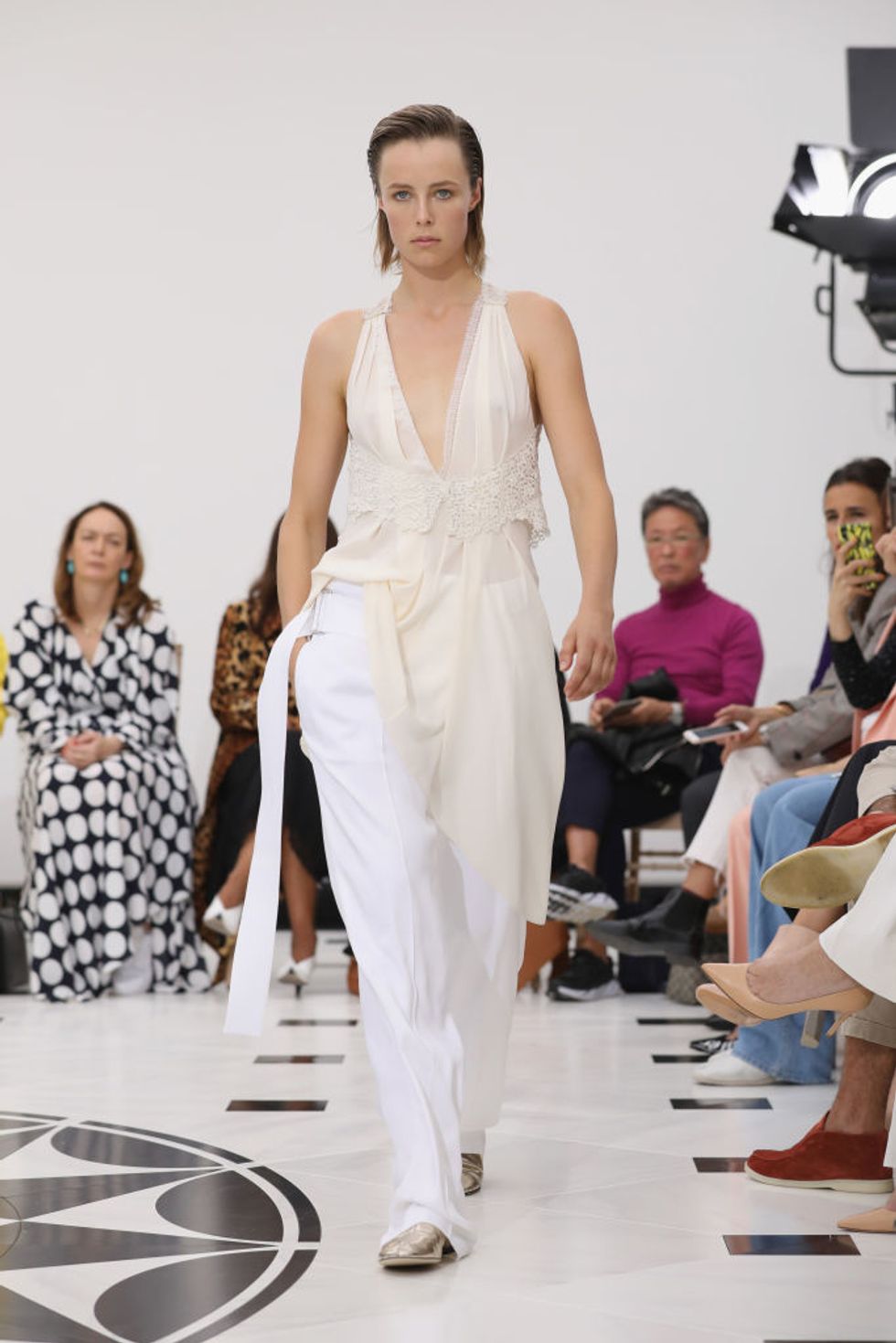 The fashion-forward looks featured in the show were a mix of flowy silhouettes, clean tailored cuts, and a bit of lace. But the signature recurring look that weaved through the whole collection were long, straight trousers with a slitted bottom paired with boots. See all the runway outfits below.