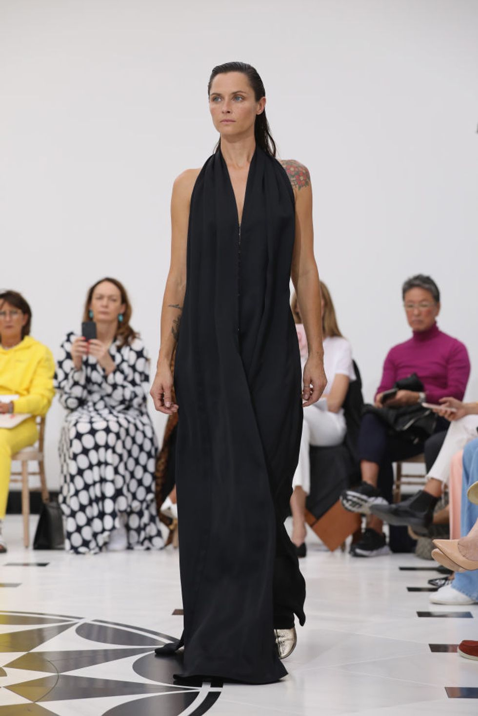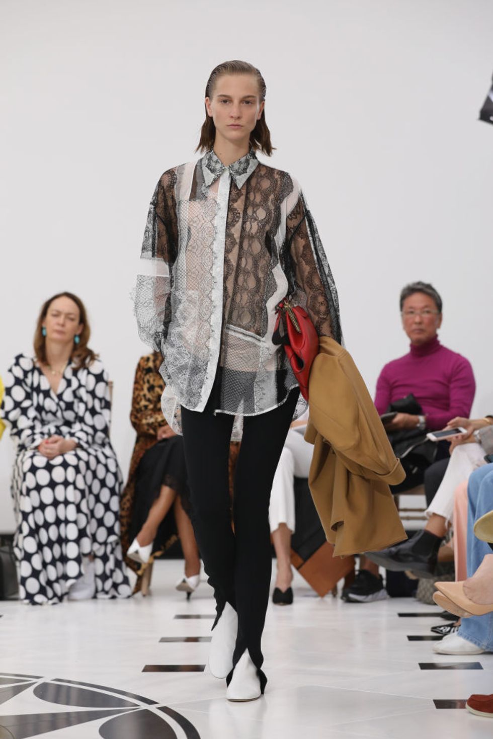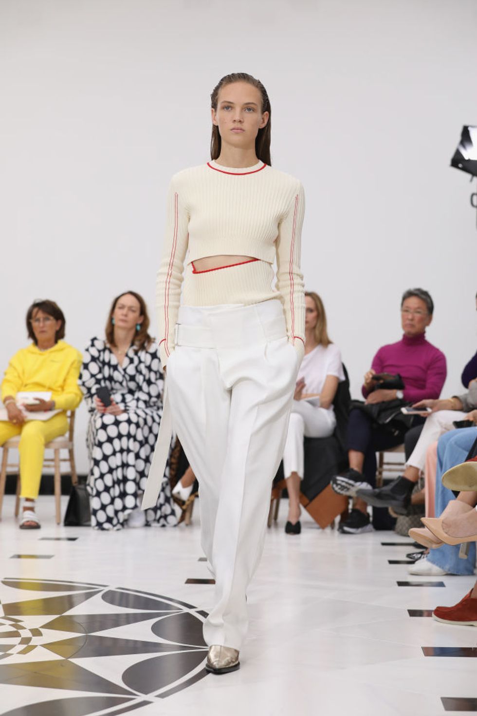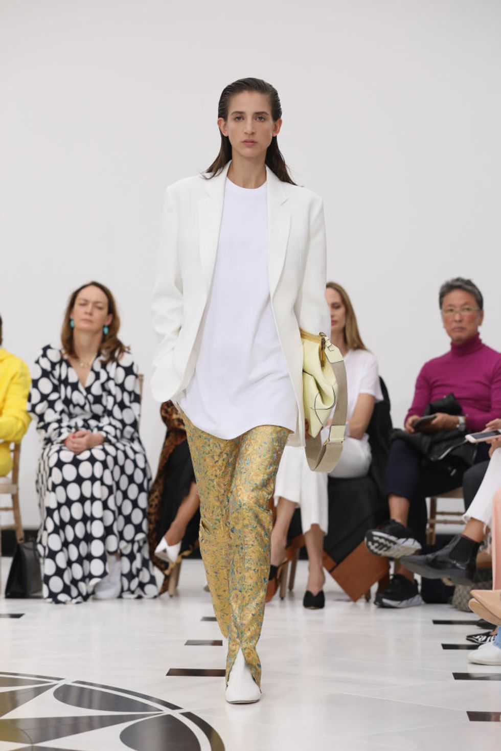 The fashion-forward looks featured in the show were a mix of flowy silhouettes, clean tailored cuts, and a bit of lace. But the signature recurring look that weaved through the whole collection were long, straight trousers with a slitted bottom paired with boots. See all the runway outfits below.