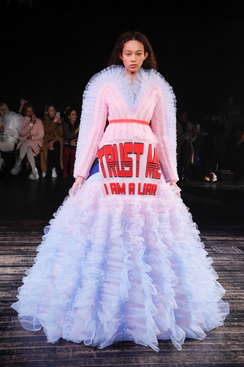 Many designers have chosen to go about this in different ways but it is Dutch design duo, Viktor & Rolf, that have easily won the "Most Instagram-able" award at this year's Paris Fashion Week with their spring 2019 collection. "An investigation into the expressive power of clothing," Viktor & Rolf marry their fervent affinity for large quantities of tulle sculpted into voluminous silhouettes with snarky captions like "Trust me, I'm a liar" and "Go Fuck Yourself." Combining all the playful relatability of a graphic tee with the visually stunning impact of haute couture, the collection had within minutes flooded Instagram with people tagging themselves as their favorite looks left and right.