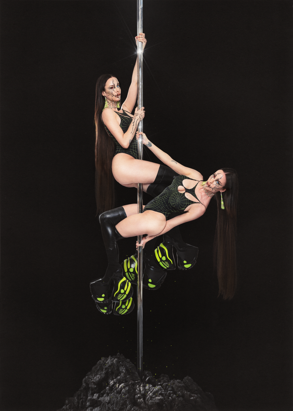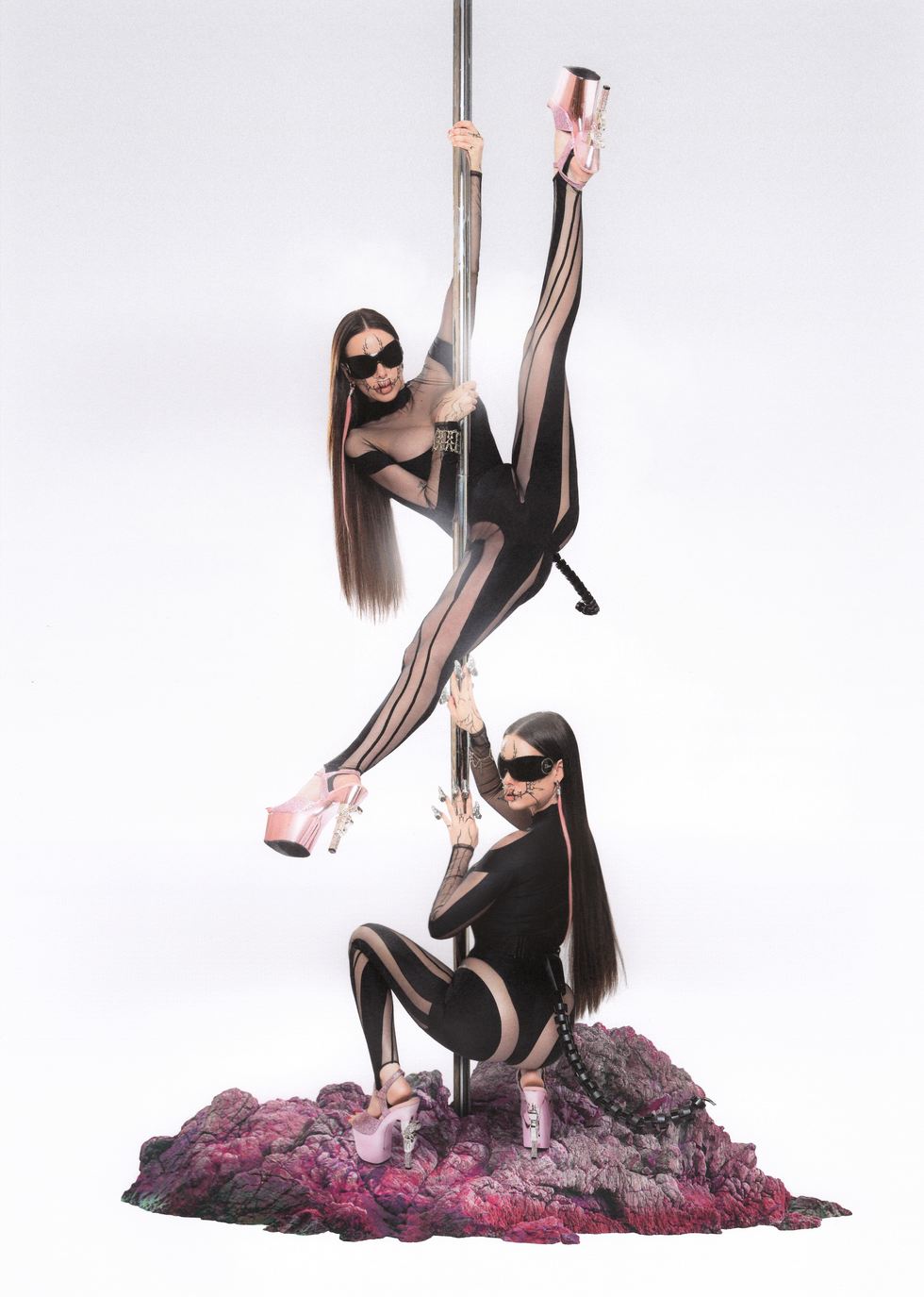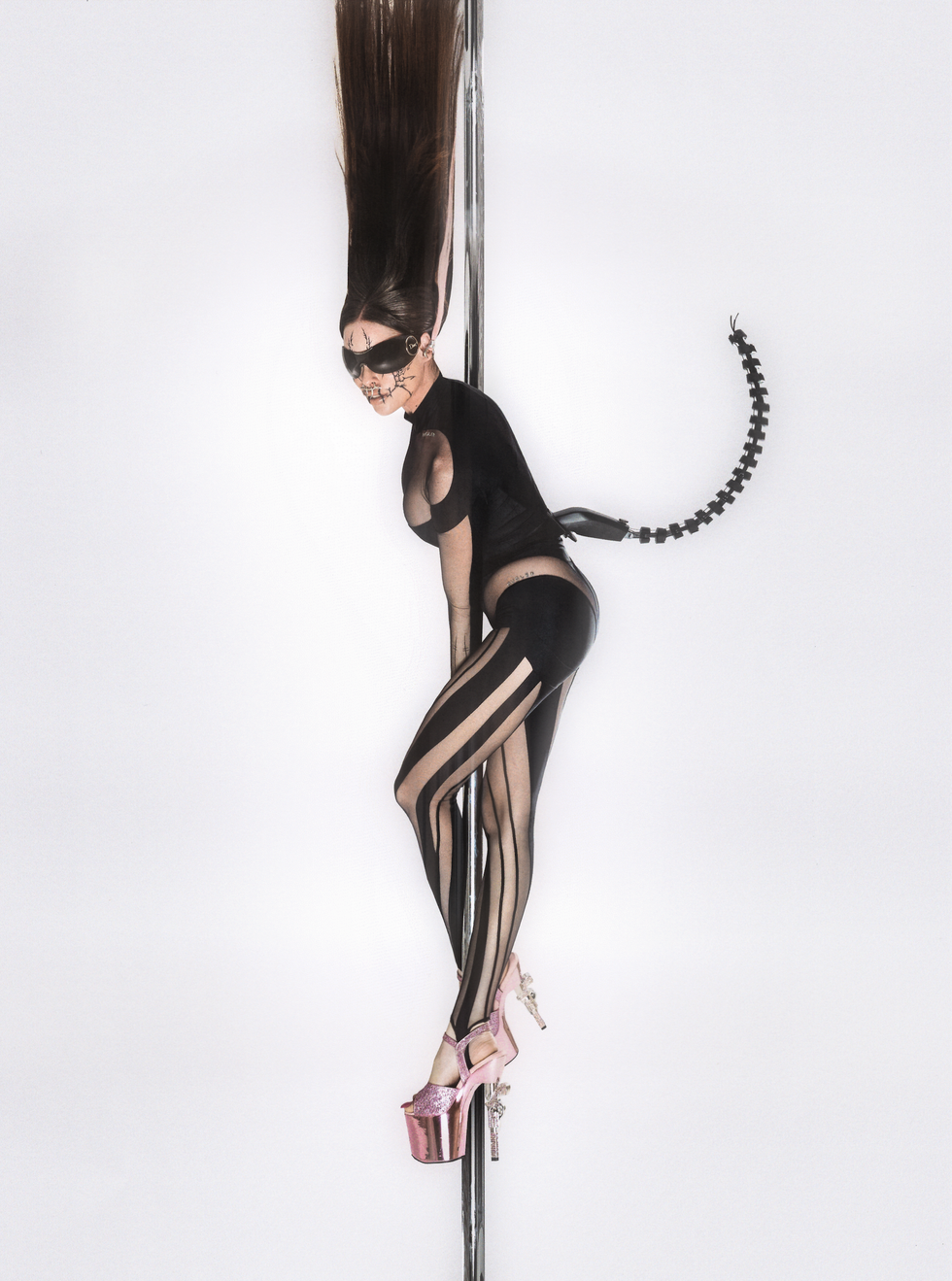Aesthetically, Virgen Maria blends couture, cosplay and fetish with references to hentai, cyberpunk, horror and more, whether that be wrapping herself in long prosthetic tongue, fashioning a bikini out of rubber guns or covering herself in croissants for the hell of it. Like a Xenomorph giving you lap dances or if David LaChapelle and Junji Ito had a lovechild, Forqué deliberately toes the line between sexy and freaky, using her body as a canvas to interrogate notions of censorship, commodification and beauty in her own twisted vision.