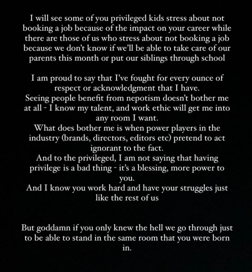 She went on to add that she's routinely come second to “nepo” models during Fashion Month, where she'd wait “hours to do a fitting/casting just to see a nepo baby walk past.”
