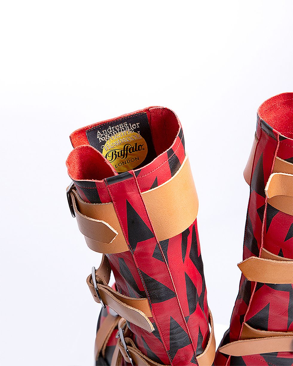 Famed British designer Vivienne Westwood has teamed up with the cult shoe brand, Buffalo London, to create two new shoes with platforms standing miles above cool. Combining iconic aspects of both labels in the hybridized styles, the shoes reimagine brand history like the first Classics platform sneaker released in 1995, and its subsequent Hightower Platform, that's now merged with Westwood's Pirate boot to create the Pirate Boot Platform. The boot comes over the knee in soft leather printed in red and black, then fastens to the top with tan buckled straps.
