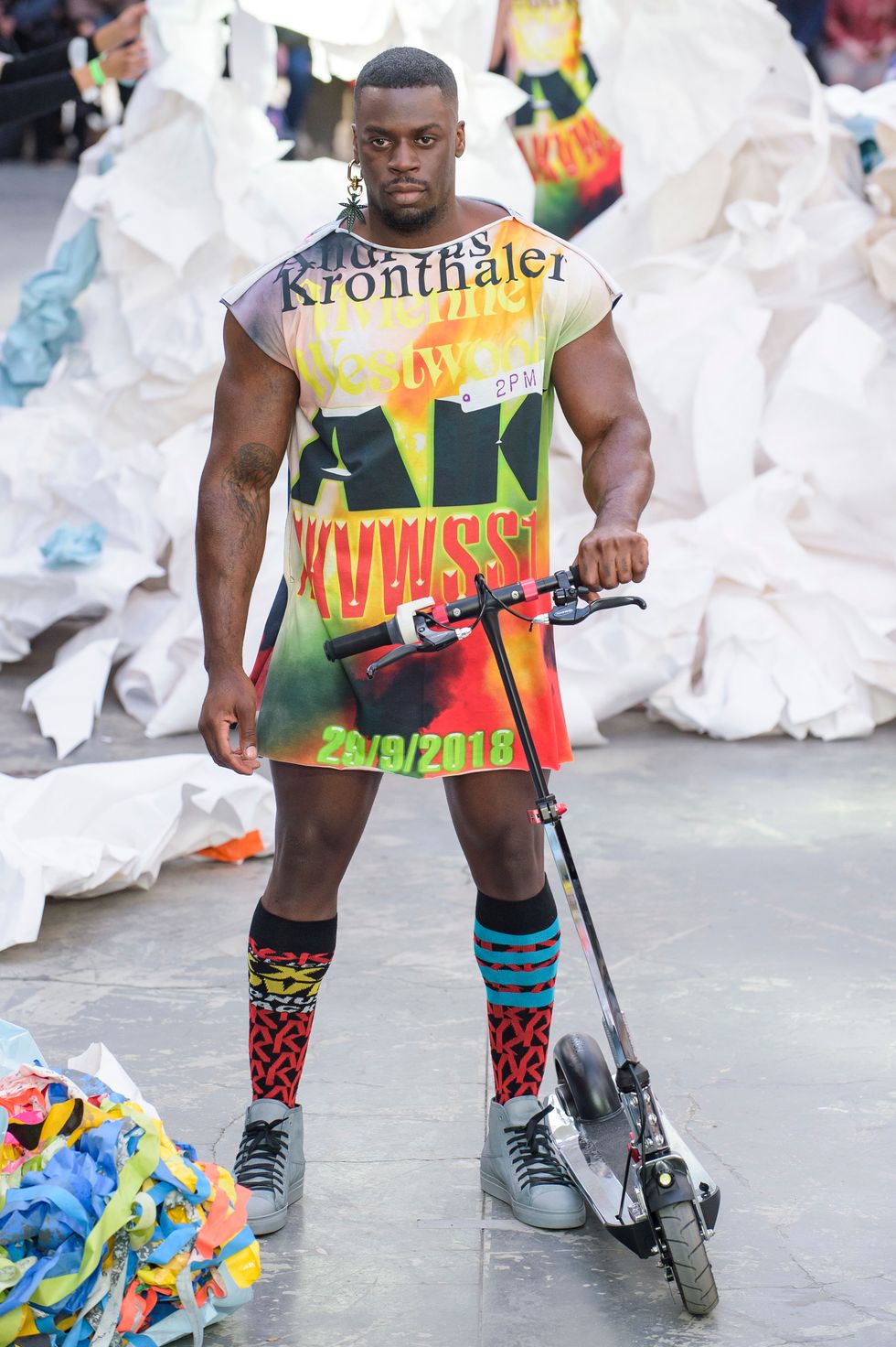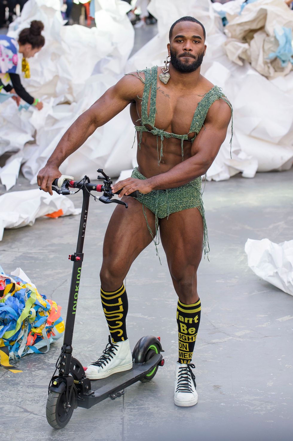 Any and all childhood memories of Razor scooters cutting open our ankles are effectively obliterated. After the rise of electric scooters this year, the technology that became the bane of cities around America and the subject of a thousand think pieces finally made it to the fashion world in the most bizarre way possible: massive bodybuilders balancing precariously on the small scooters in various states of undress.