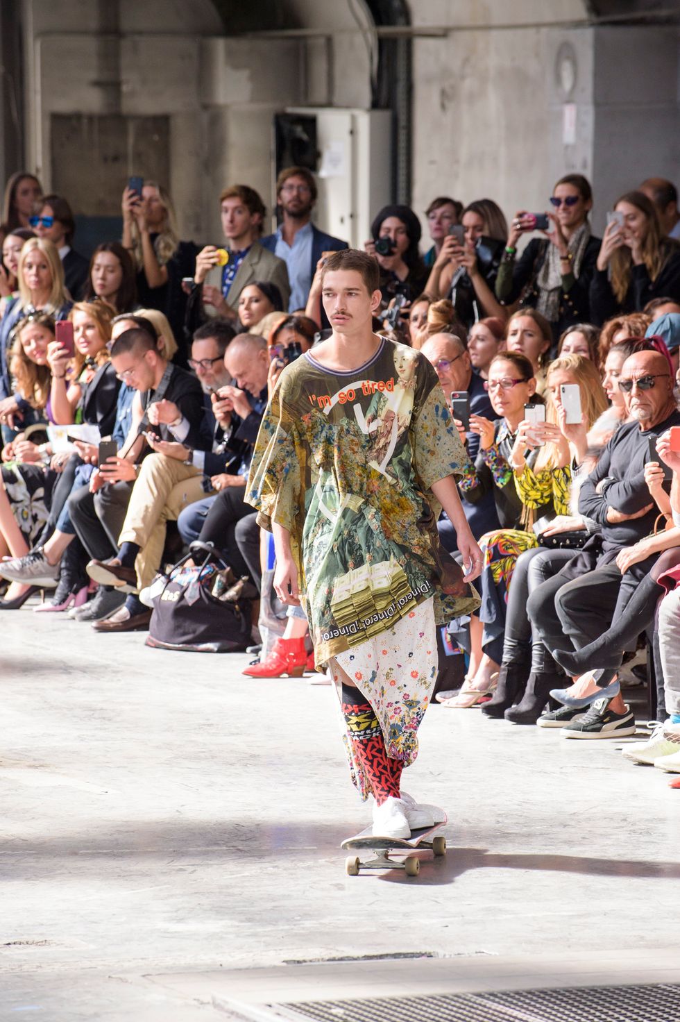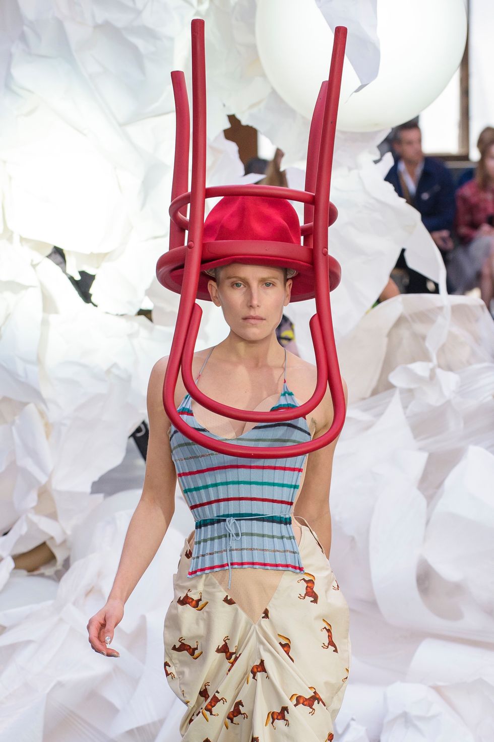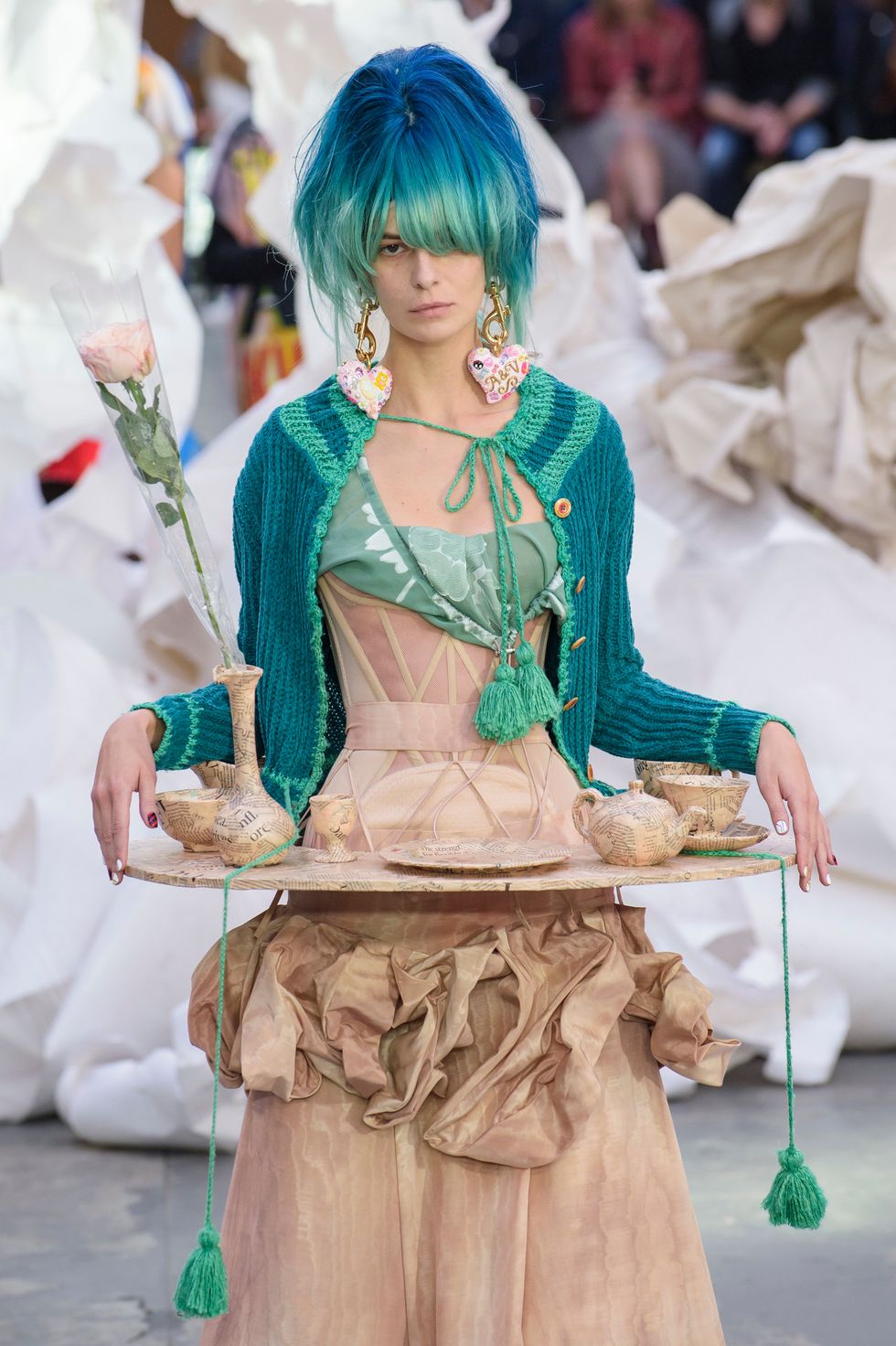 Entering the event space for the latest Andreas Kronthaler for Vivienne Westwood show was a bit like going down the rabbit hole. A paper wonderland of clouds and structures by designer Gary Card set the literal stage for one of the most eccentric offerings of Paris Fashion Week (even if it was par for the course for the unconventional designer).