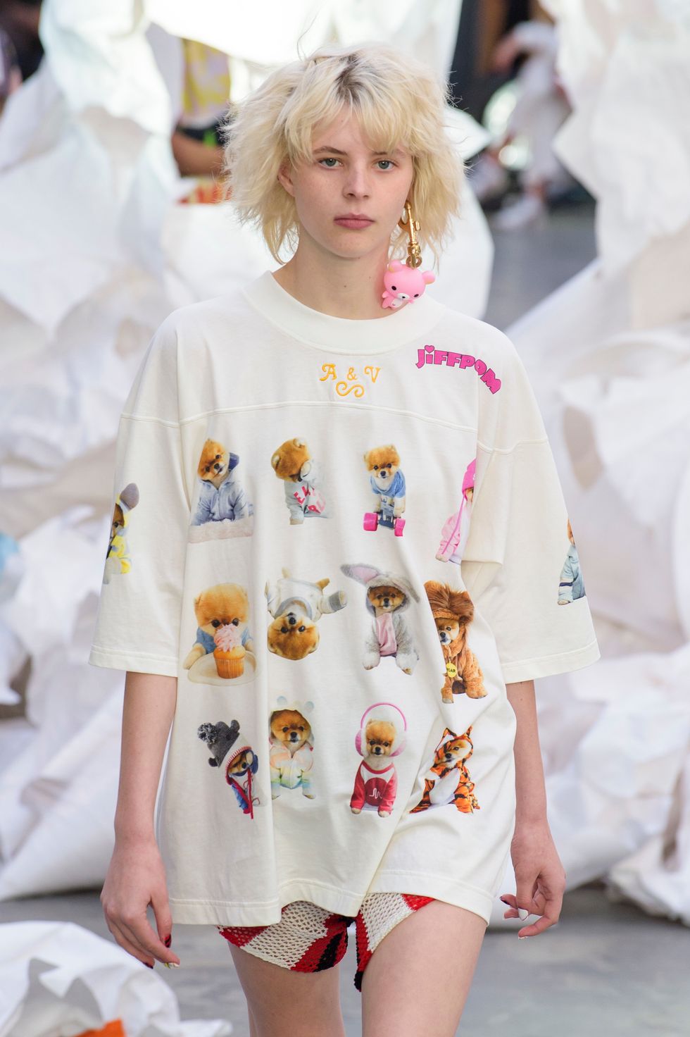 We now know that when Westwood and Kronthaler aren't designing clothes, they're scrolling the Instagram of @jiffpom the pomernian just like the rest of us. The breed of dog showed up on an oversized white t-shirt dress, and we need it immediately.