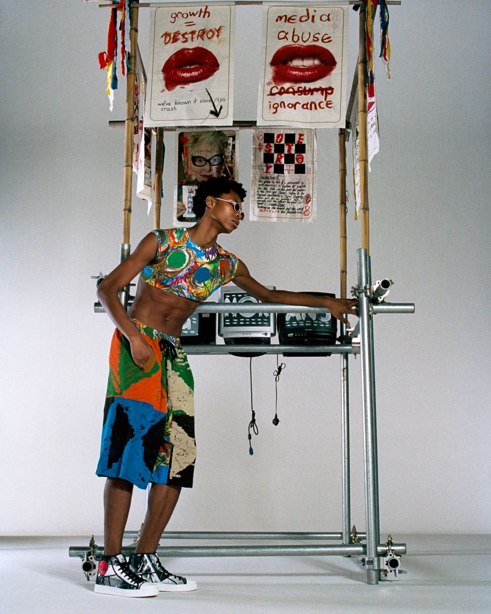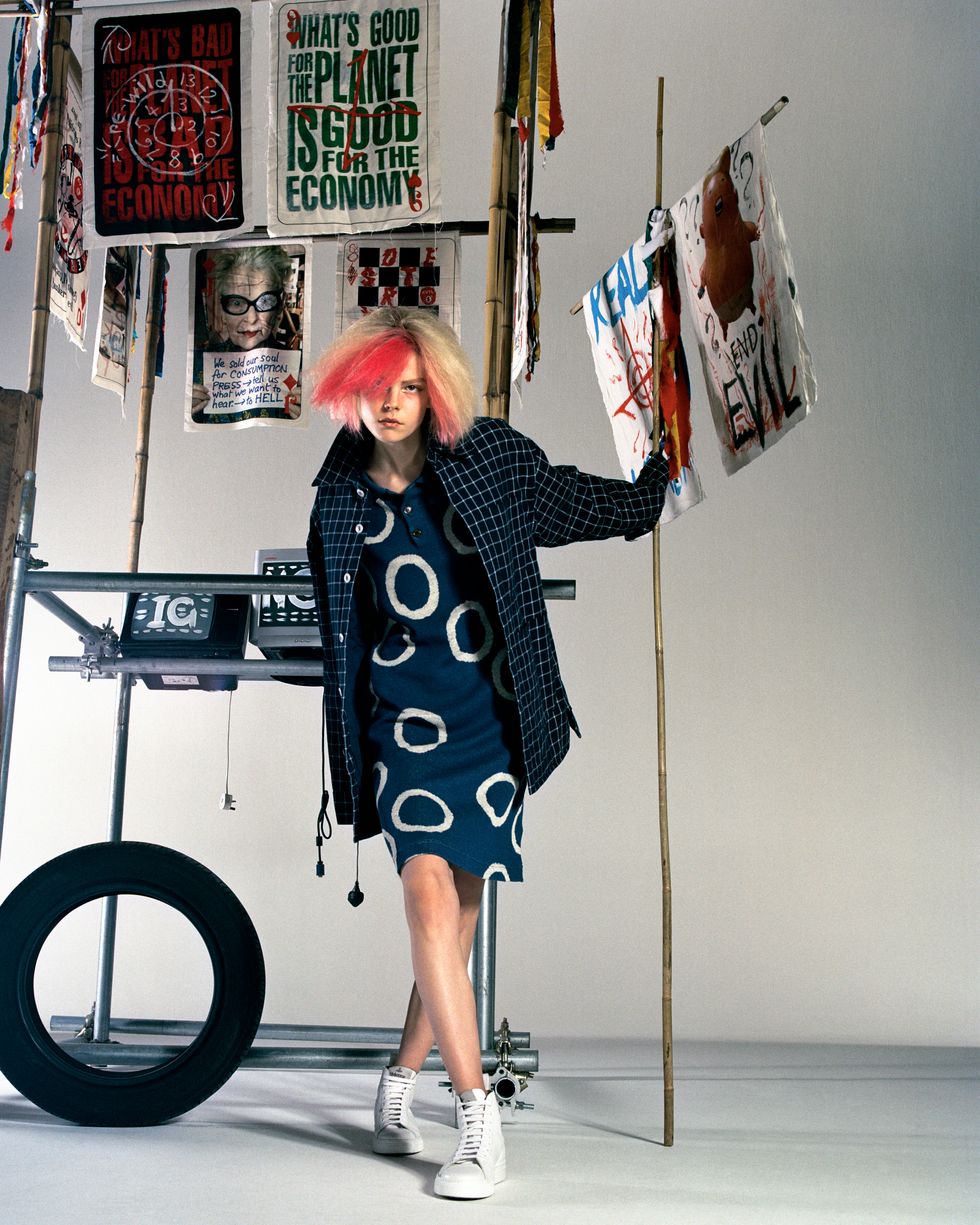 "Governments cause poverty, poverty is the cause of crime, therefore, politicians are criminals," she says matter-of-factly. The accompanying lookbook showcases the unisex spring collection on a variety of men and women posing against signs reading "What's bad for the planet is bad for the economy" and "What good for the planet is good for the economy."