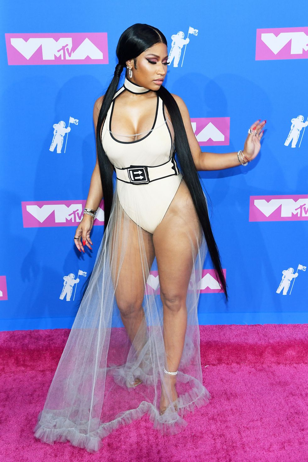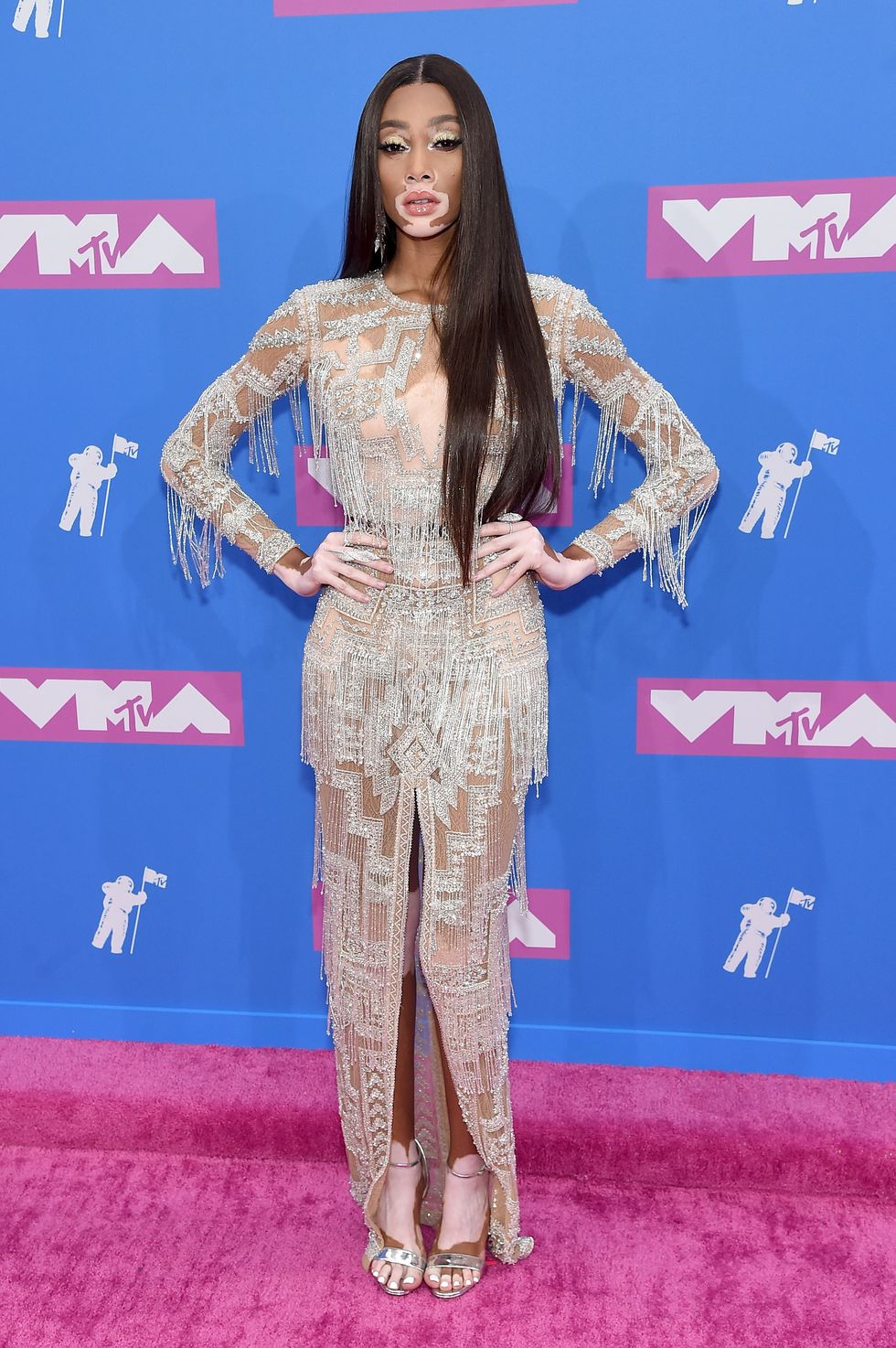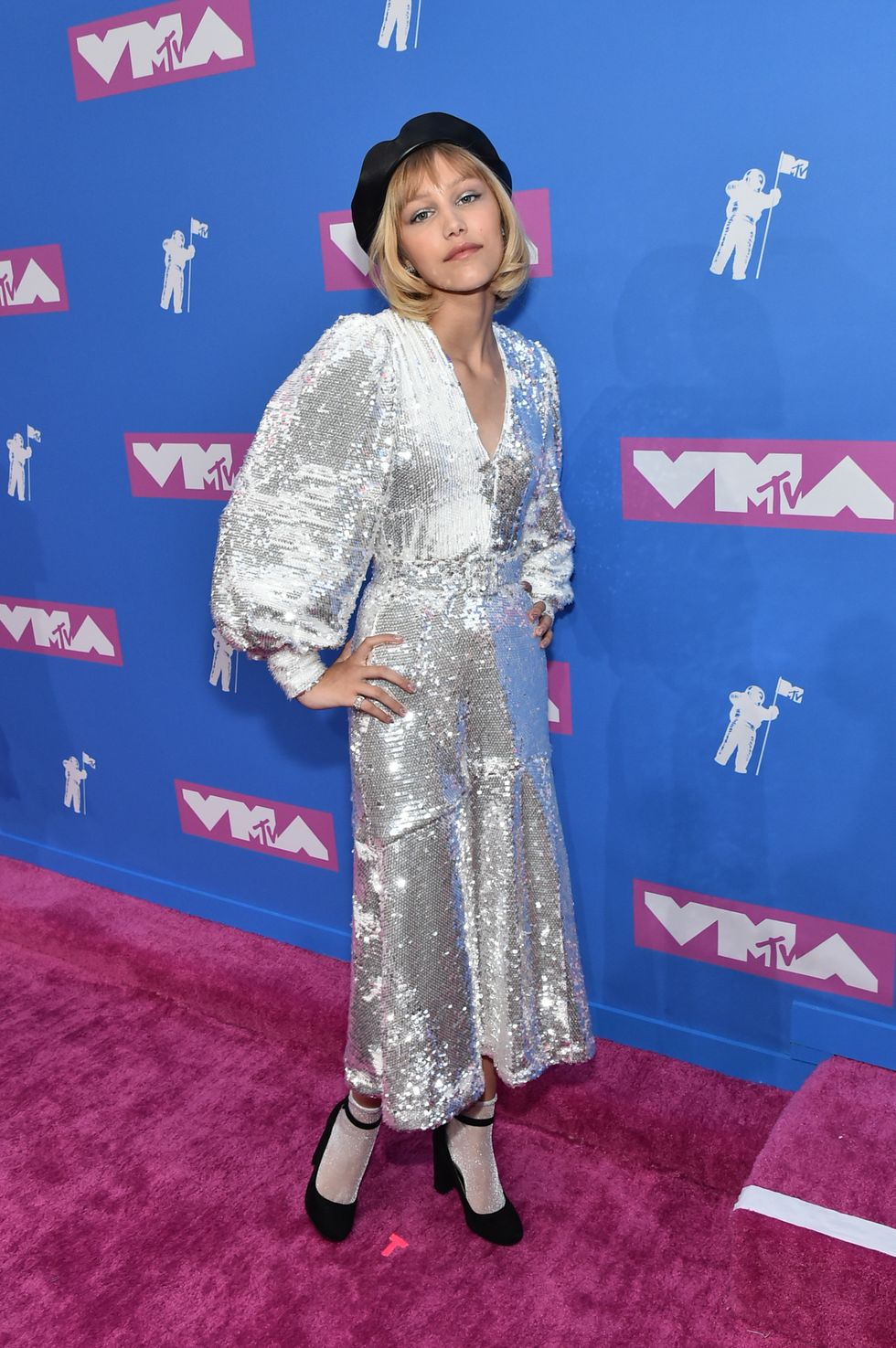 Last night, on the pink carpet at MTV's 34th annual Video Music Awards, favored red-carpet looks got a makeover. The body-skimming "naked dress" — think Beyoncé attending the MET Gala in Givenchy Haute Couture par Riccardo Tisci — evolved into sheer column dresses, jumpsuits, and cocktail length numbers worn by Tiffany Haddish, Shanina Shaik, and Dascha Polanco respectively. Metallic fabrics and sequins, typically reserved for ornate and avant-garde looks, were translated into streamlined gowns donned by Jennifer Lopez and Karlie Kloss and easy two-piece ensembles seen on Noah Cyrus and Bebe Rexha.