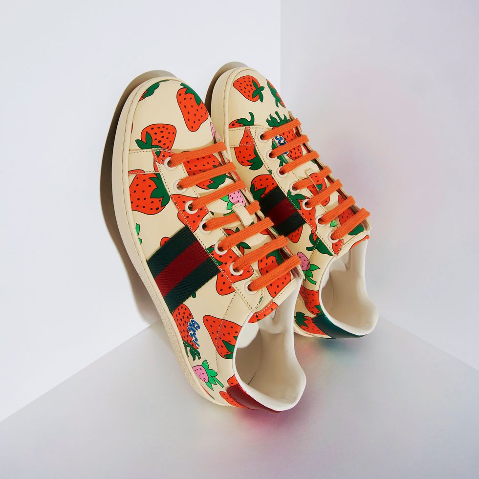 The sneakers are made in Italy, from calfskin. As for the print, it's a signature of the spring 2019 collection, appearing on fabrics and other ready-to-wear items from the brand. Look out for the one strawberry that appears to be bitten into — there's a discreet Gucci logo just above the teeth marks.