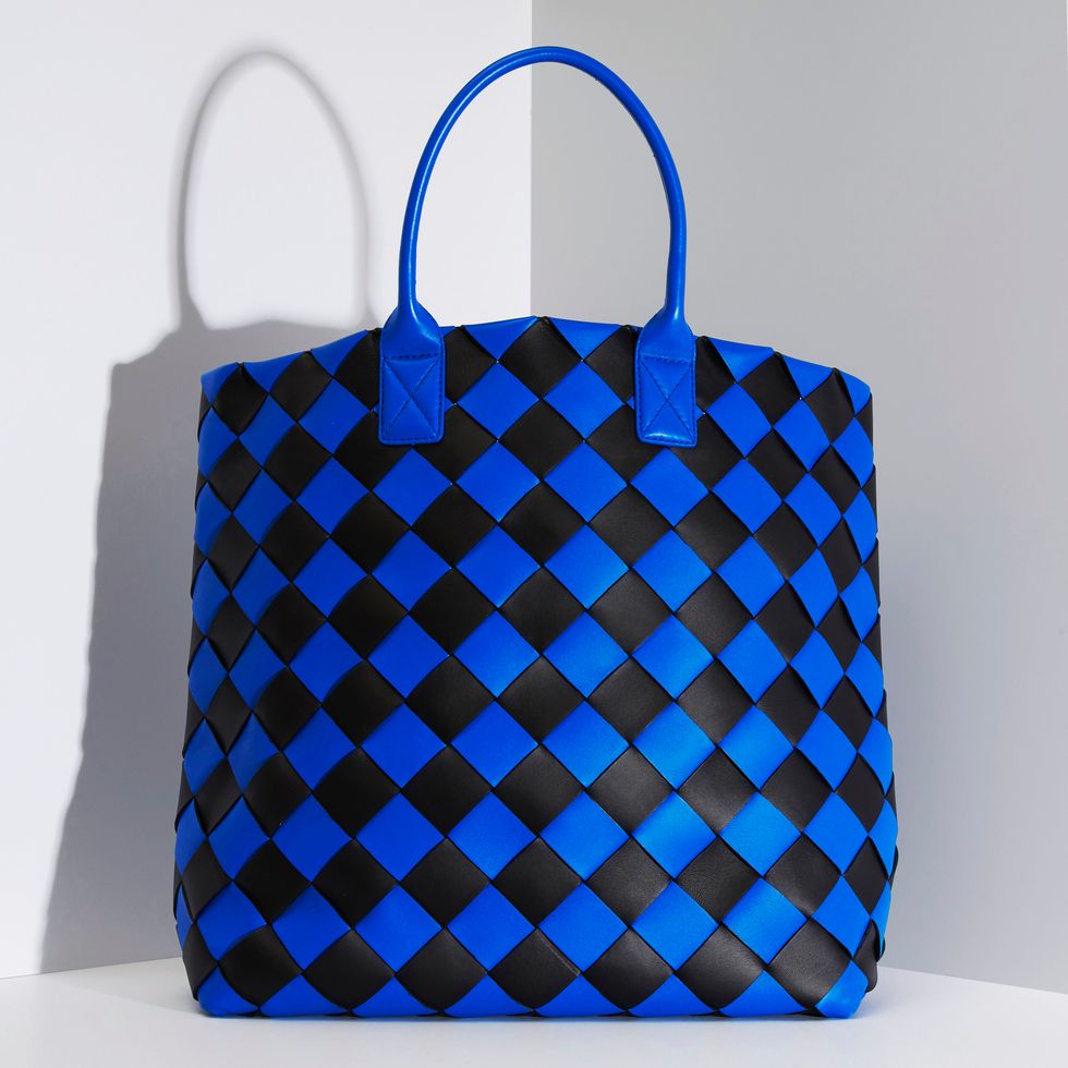 To say Bottega Veneta's focus is on intricate craftsmanship would be an understatement. Take, for example, the Cabat bag in blue and black. This bag is made by hand: thin strips of double-faced leather, dubbed 'fettucce,' are woven together. The bag was first conceived in 2001 when Bottega Veneta introduced its signature intrecciato craftsmanship.