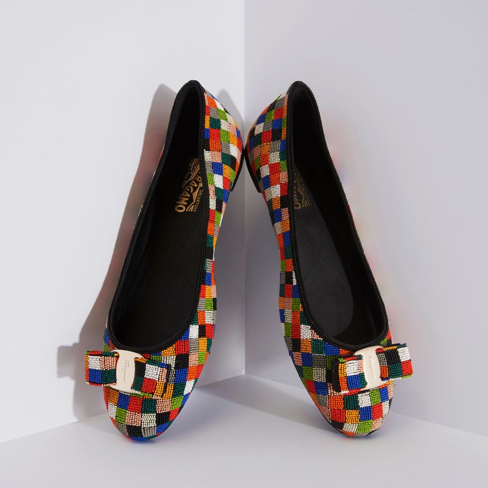 Ferragamo's beaded flat from spring 2019 is one of the most intricate footwear options of the season. Shining glass beads in a multitude of colors cover the surface of the leather flats, lined with suede piping and a satin base. The shoe is produced in Italy. Overall it takes at least 15 different people, all with a variety of different skills, to complete a single pair.