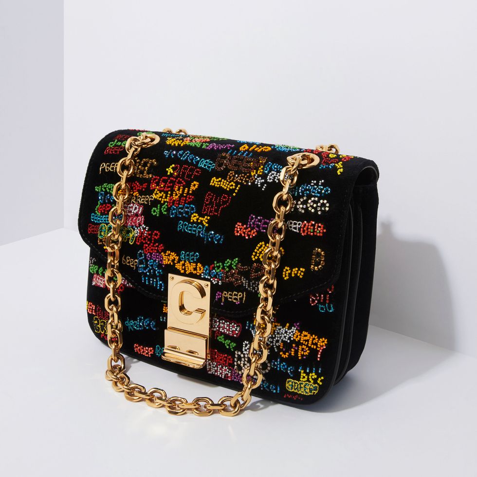 This particular bag is made of lush black velvet and embroidered with Marclay's work. The artist's own paintings and collages take inspiration from elements carefully sourced vintage comics: hence the embroidered "beep" phrase scattered throughout. These flashes of Marclay's artwork can also be found in patches on the back of jackets and parkas throughout Celine's spring 2019 collection.
