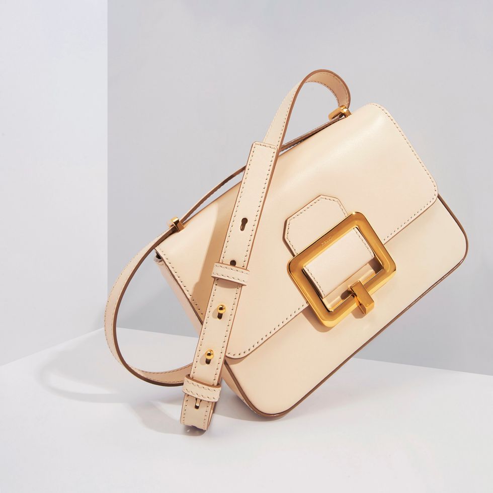 Utilizing the same well-loved chunky buckle, the rectangular bag has a short top handle and is rendered in calf leather. The Janelle bag is assembled in a particular way dubbed "fit assembly" by the brand. First, the bag is constructed around a wooden shape. This building method allows the bag to maintain the rectangular shape that identifies with the Janelle style internally and externally. The various parts of the bag are then sewn through machinery created specifically for this model of bag. The bag is then finished with a polished wax rib. To top it all off, the iconic Janelle Bag closure has been created with a special mold and has a mechanism with a 90° snap closure, so it always automatically returns to the exact opening and closing point.